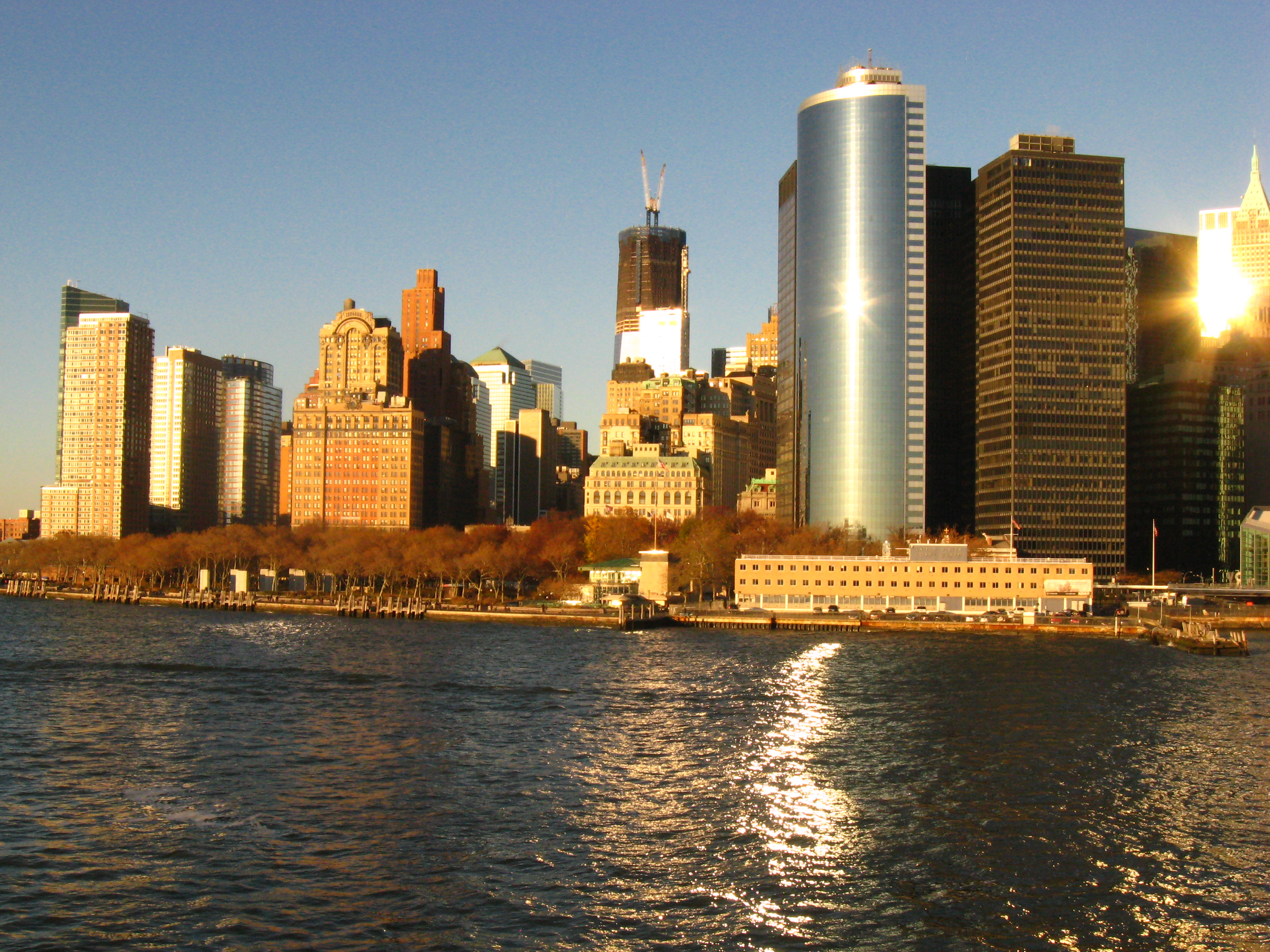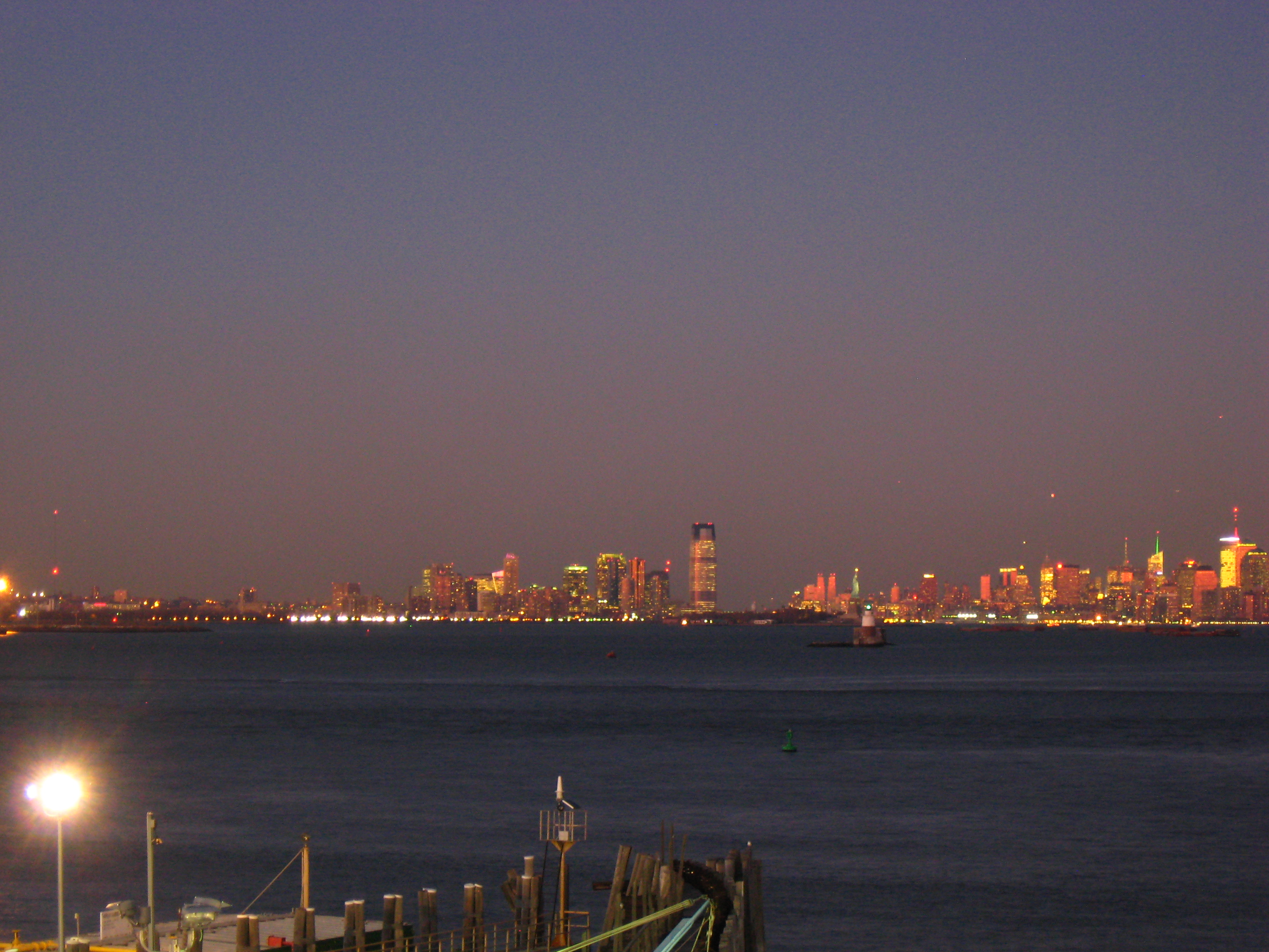 Ich suchte im Wesentlichen mal wieder nen Restroom und Kaffee. Also ging ich ein paar Schritte ins „Landesinnere“. Ich fand eine hübsche, kleine Kirche, einen Pub und einen Laden, wo ich für einen Dollar einen Kaffee bekam (Restroom inklusive). Nachdem ich ein paar nette Worte mit dem Mann, der mir den Kaffee verkaufte (der gar nicht übel war)  gewechselt hatte, nahm ich noch einen zweiten Kaffee für den Weg, und mit dem Koffeinträger in der Hand und AC/DC im Ohr pilgerte ich zurück zur Wasserseite. Es dämmerte, und die Skyline Lower Manhattans begann zu leuchten. Als ich knipste, fragte mich ein Mann, ob da große Gebäude schon zum neuaufgebauten World Trade Center gehöre und ob schon was fertig sei. Ich antwortete auf Englisch, das sei das One World Trade Center, zur Zeit 290 Meter hoch, geplant über 500 Meter und das neue WTC 7 sei schon fertiggestellt. Das alte WTC 7 war durch herabfallende Teile der großen Türme und Feuer so stark beschädigt, dass es abgerissen und durch einen Neubau ersetzt wurde. Nachdem er mich gefragt hatte, wo ich herkomme, konnten wir uns dann auf Deutsch weiter unterhalten. Er erzählte, dass er mit einem Containerschiff als Passagier über New Orleans eingereist sei.