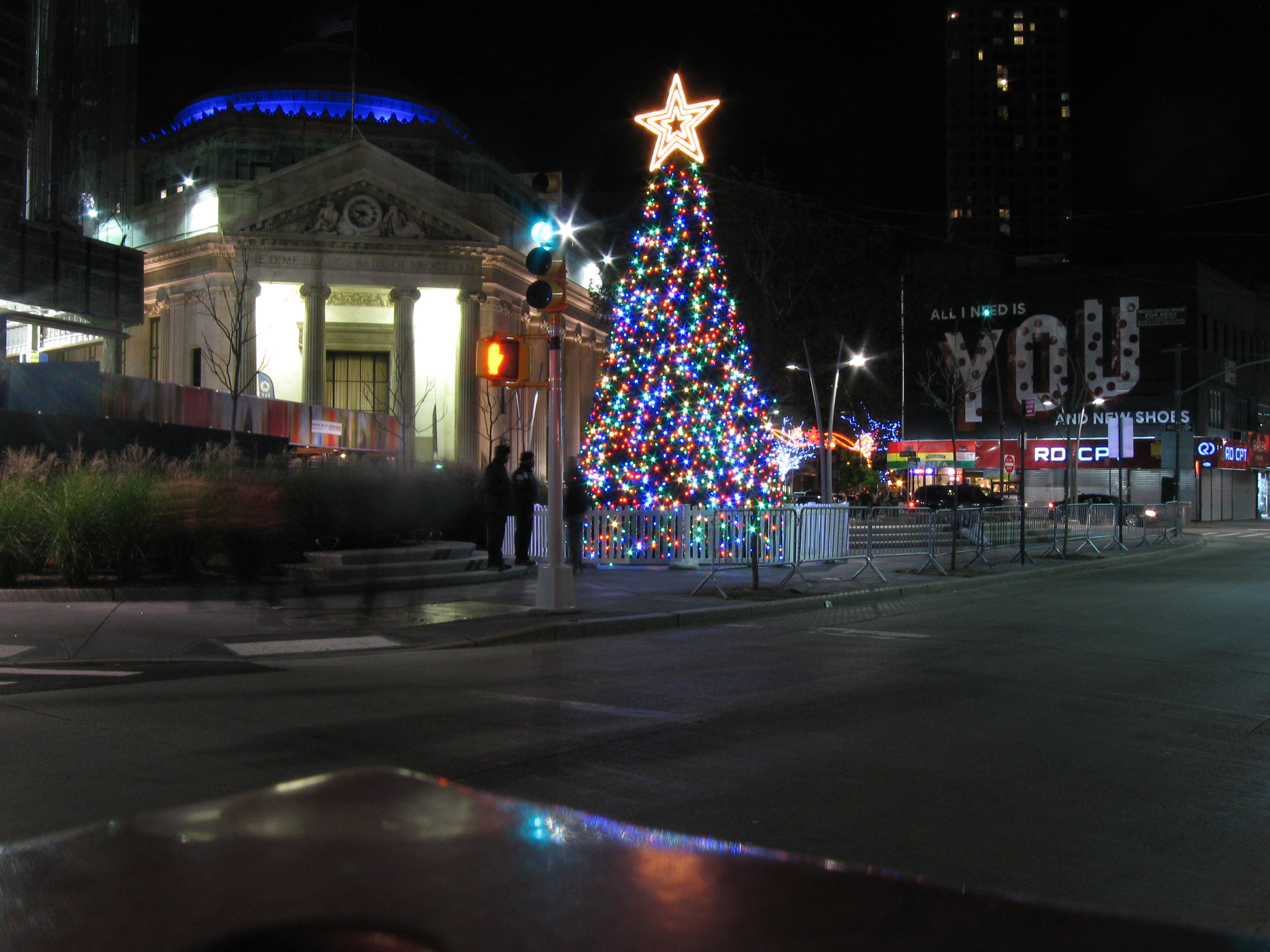 Auf der Brooklyn-Seite angekommen verpasste ich irgendwie die Fußgängertreppe, die ich vorgestern benutzt hatte. Ich ging einfach weiter und war dann irgendwie in so einem College-Viertel mit Tech- und Law-Schools. Mir war ein wenig danach, einfach zu bummeln und der Nase nach die Gegend zu erkunden. Irgendwann bog ich in die Fulton Mall ein, eine Straße, in der bereits Weihnachtsbeleuchtung installiert war. Hier gab es eine Menge Geschäfte. Vor allem: Schuhgeschäfte. (Dass mir an dieser Stelle niemand auf falsche Ideen kommt!) Es war Zeit, was zu essen und… naja, halt das andere. Ich war dann einfach bei Mc’D, wo auch schon Weihnachtsmusik lief. Hab da halt gefuttert, leider war dann ein Restroom „Out of order“ und vor dem anderen eine Schlange. Hab dann verzichtet und bin weiter die Fulton Mall runtergegangen. In einer Pharmacy erstand ich einen Chapstick. Für die, die nicht wissen, was das ist: Quasi ein Labello. Es gab auch Nivea-Dinger, aber die kosteten 1,50 Dollar mehr, und hey, wozu ist man in den USA. Ich kauf hier ja auch kein Becks-Bier.
