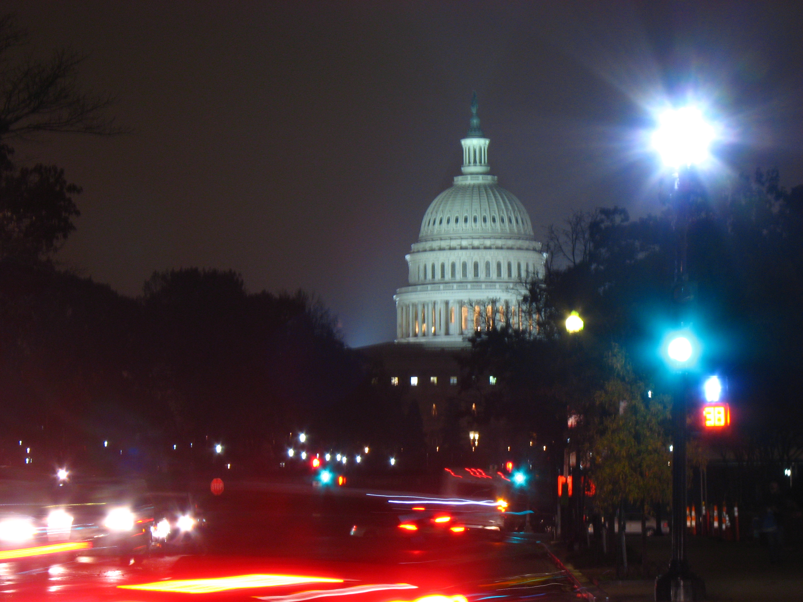 Danach war es schon dunkel, und ich entschied, zumindest nochmal zum Capitol, das nur ein paar Blocks entfernt ist, zu gehen. Es nieselte leicht. Aber ich konnte ein paar ganz gute Fotos machen. Das Gebäude ist extrem beeindruckend. Riesig groß. Und mir persönlich gefällt es architektonisch recht gut, ist schon ein sehr repräsentatives Haus. Ich fragte eine Polizei/Security (whatever) Frau nach den Öffnungszeiten, 9 AM – 3 PM. Mal sehen, mach ich vielleicht morgen, obwohl mich das Smithonian Air and Space Museum hier natürlich mehr reizt.