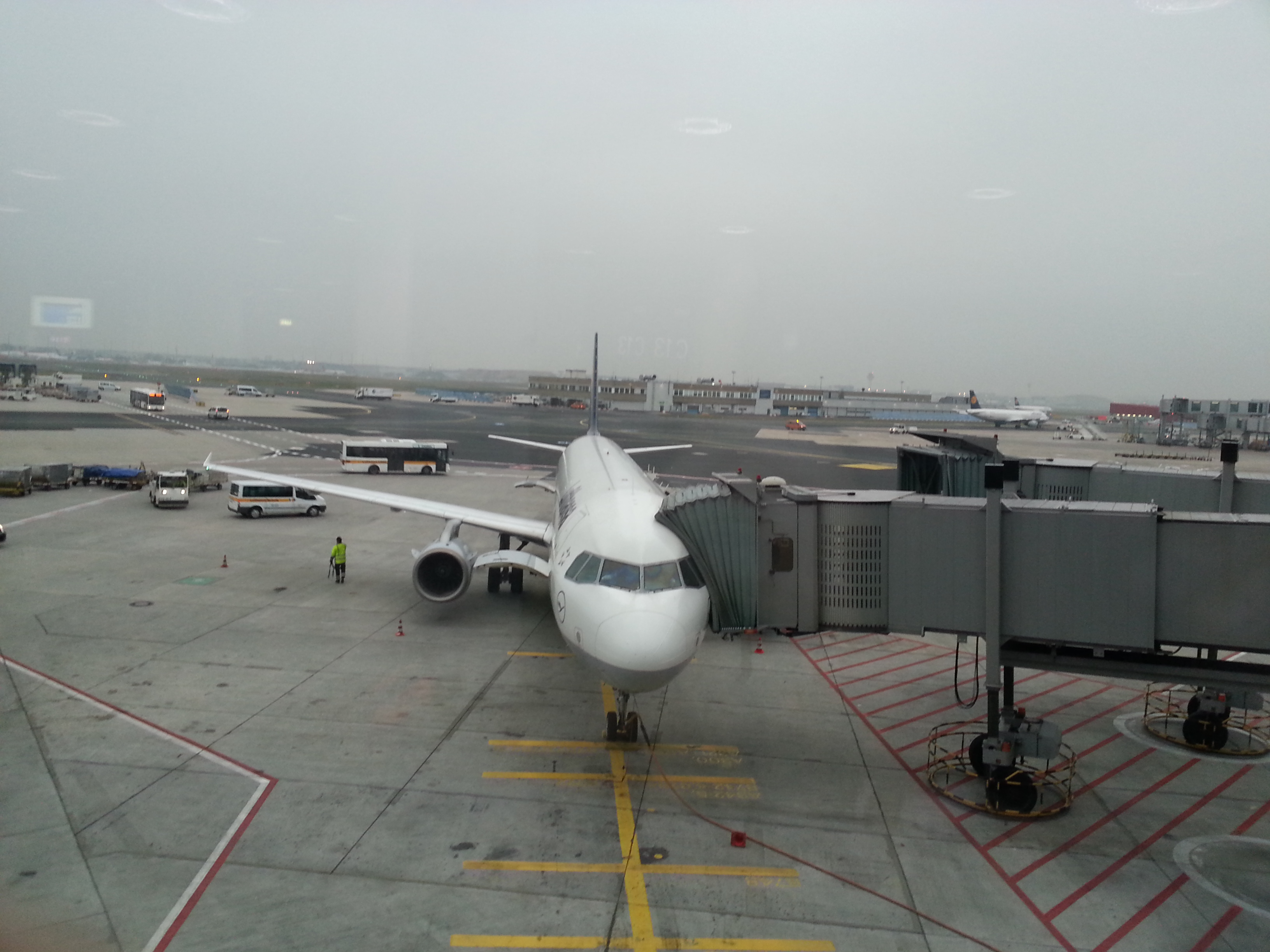 Nach dem Aufstehen machte meine liebe Gastgeberin mir noch einen Kaffee und ich fuhr dann mit der S-Bahn zum Flughafen, wobei mich mein lieber Gastgeber noch bis zur Hauptwache begleitete. Von da in die S8 Richtung Wiesbaden, Ankunft am Flughafen ziemlich genau um acht Uhr, zwei Stunden vor Abflug. Ich bin dann erstmal zum Bereich C, um festzustellen, dass Drop-off Schalter der Lufthansa in A sind… d.h. mein Schalter (angeblich 260-335) war dann in B. Also gefühlte drei Kilometer zunehmend nervös abgerissen. Bei der Sicherheit haben die noch irgendwas mit meinem Mobiltelefon gemacht, aber dann war ich durch und kurz vor Neun am Gate.