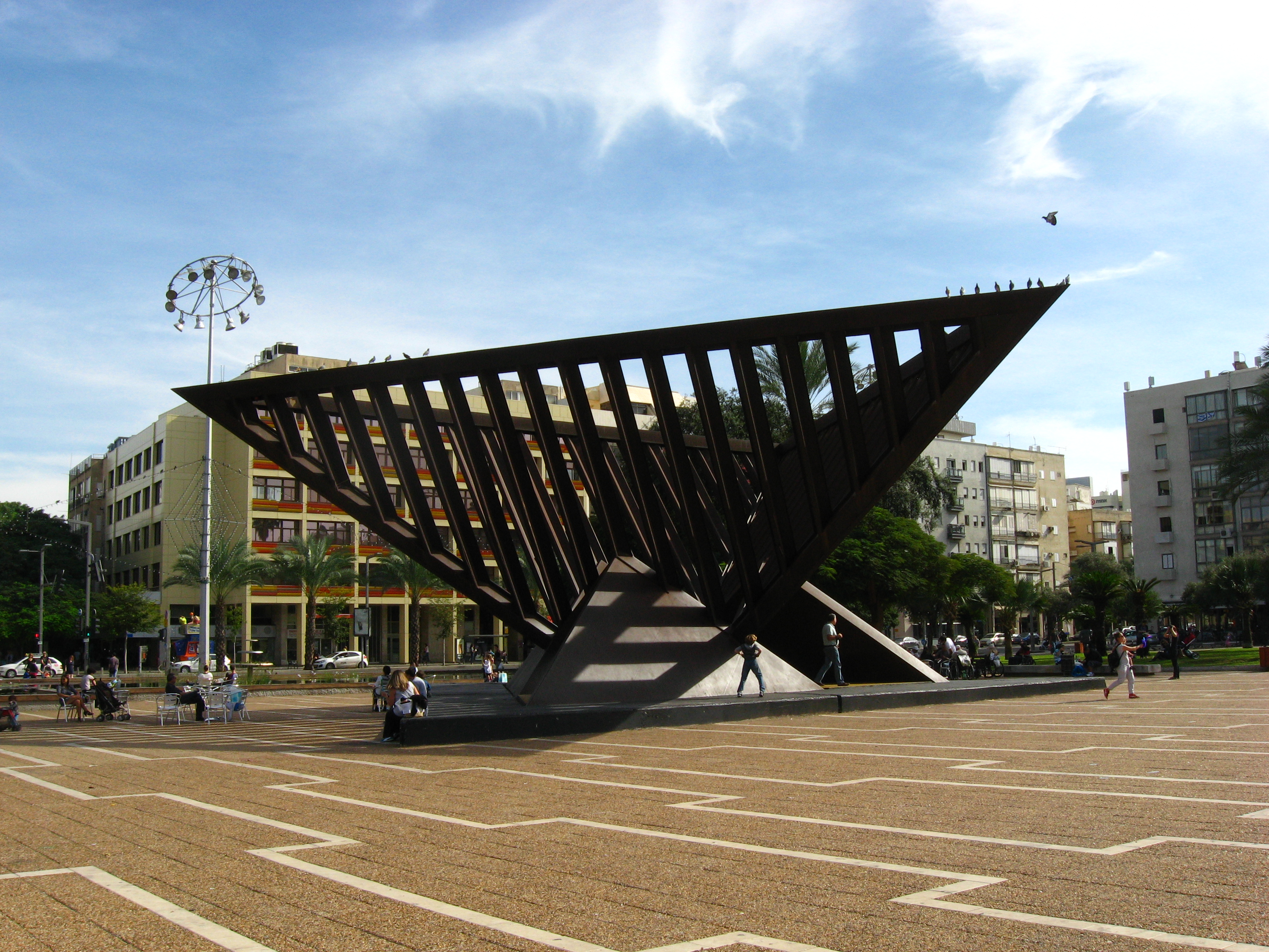 Nun, die Israelis ließen sich jedenfalls nicht aus der Ruhe bringen und kehrten an ihre Tische, wo sie ihr Essen oder ihre Getränke stehen lassen hatten zurück und machten einfach da weiter, wo sie aufgehört hatten. Scheinbar völlig unberührt. Also, dachte ich mir, warum sollte ich es anders machen? Also raus und weiter. Mein Weg führte mich dann zum Kika Har’Medina, einem riesigen Kreisverkehr in dessen Zentrum ein kleiner Park liegt. Hier machte ich Pause und verzehrte einen Apfel und eine Banane, die ich vom Frühstück mitgenommen hatte. Zu der Zeit hatte ich schon immer so Gedanken wie „Wohin gehe ich jetzt in Deckung, falls Alarm kommt? Ist es in der Nähe von Gebäuden nicht sicherer als hier auf dieser weiten Fläche?“. Zumindest schadet es nicht, sowas im Auge zu behalten.