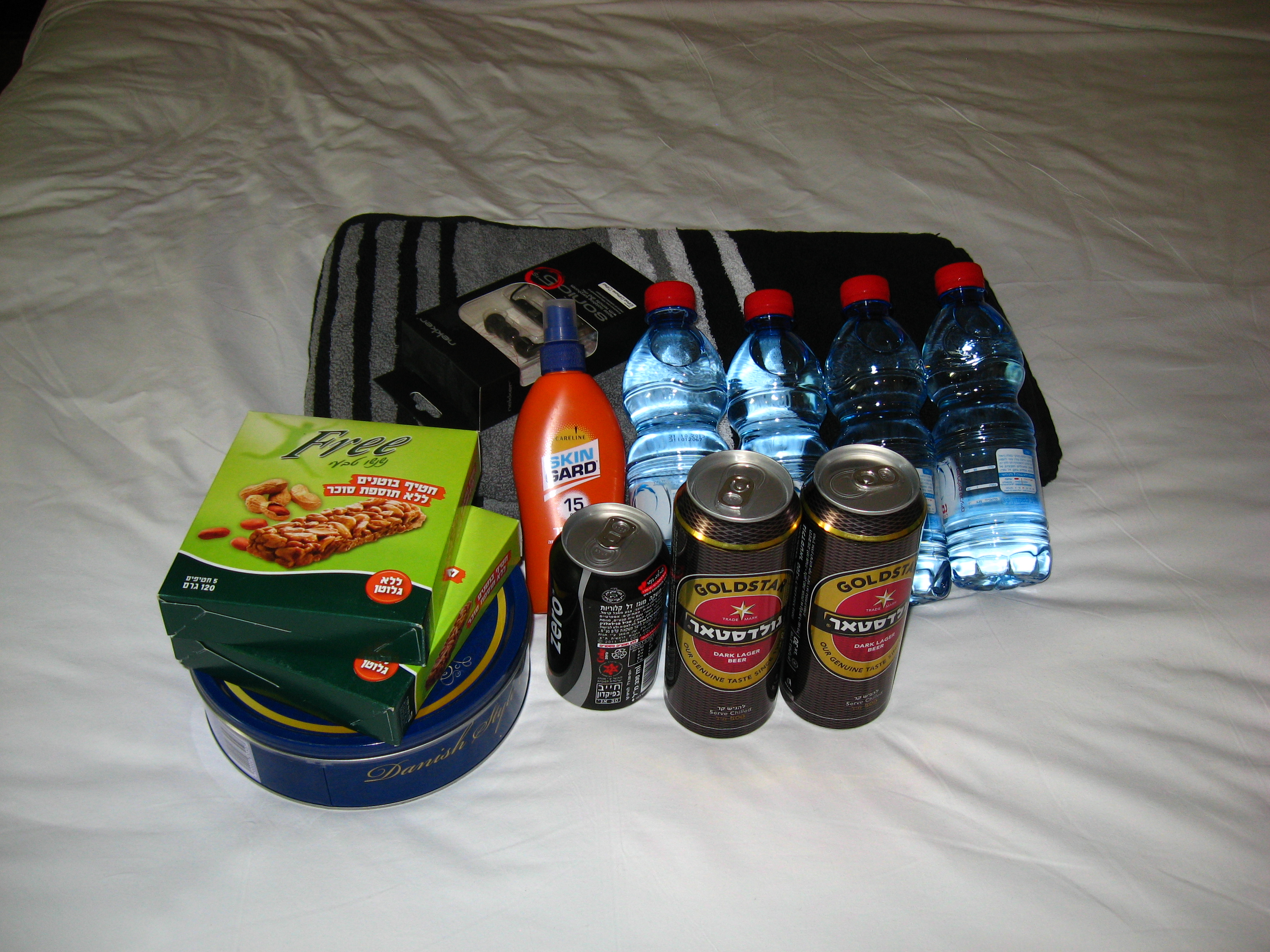Die Einkäufe des Tages: Handtuch, Sonnenschutzmittel (war nicht leicht zu finden, die Israelis brauchen sowas vielleicht auch nicht), Goldstern Bier, Coke Zero, Wasser, Müsliriegel, dänische Kekse.