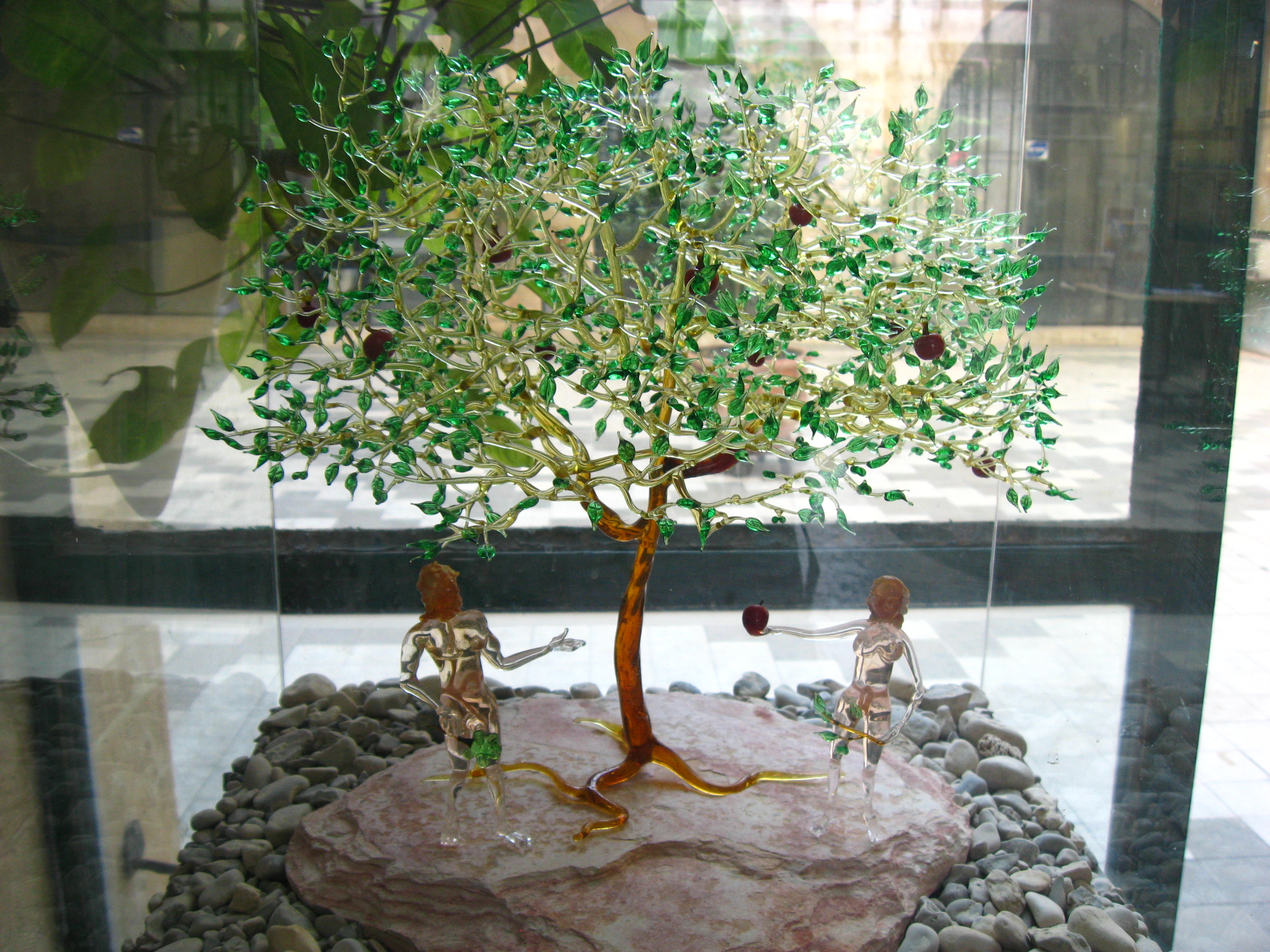 Baum der Erkenntnis in Glas mit Adam (links) und Eva (rechts, mit Frucht)