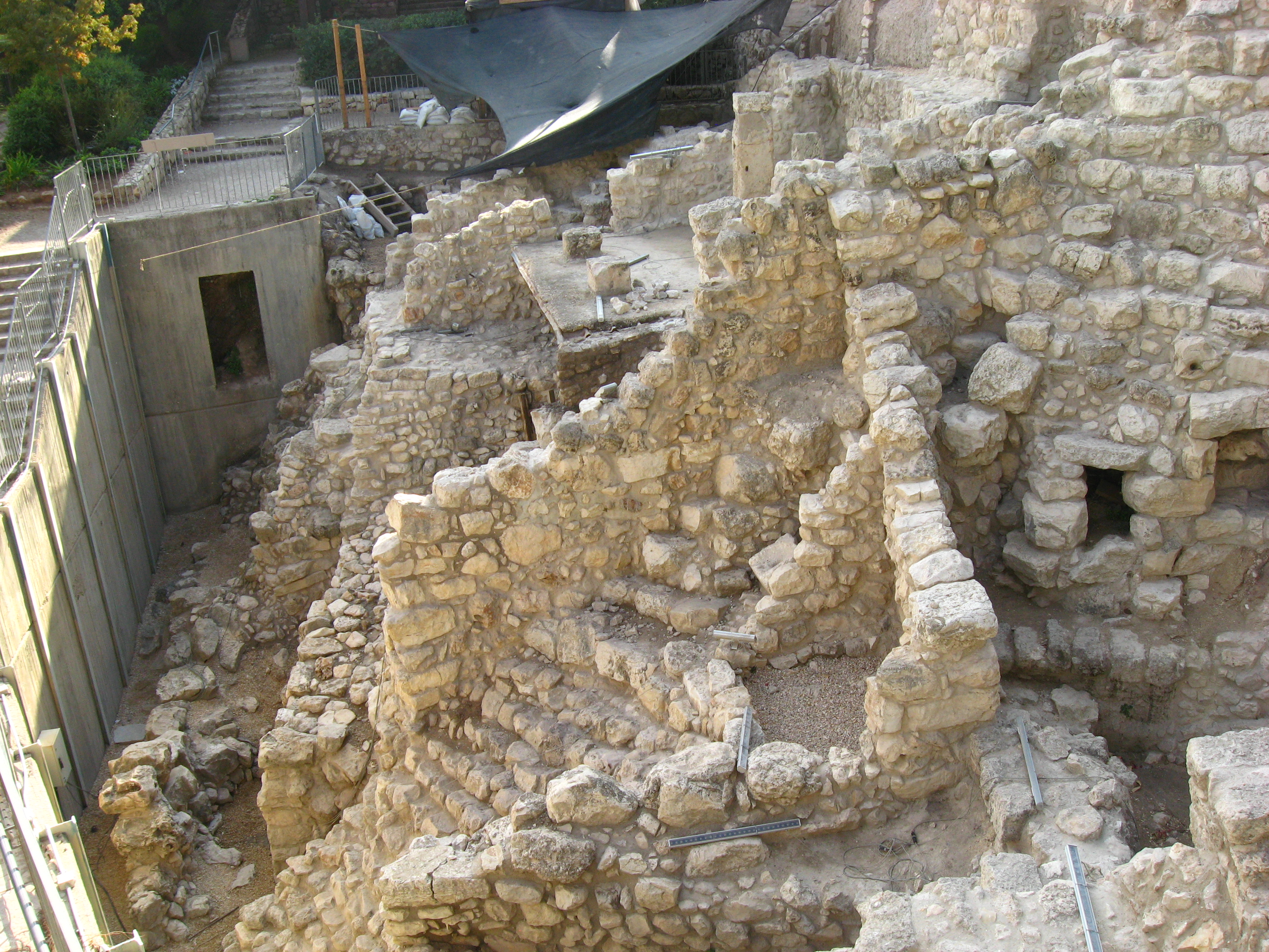 Nach dem Kaffee kauften wir uns Tickets für die Anlage und begannen die Besichtigungstour. Vor der Herrschaft Davids war die Anlage eine kanaanäische Festung gewesen. Auf den Erklärungstafeln wurde historisch, wie man das von den Zeittafeln in Bibeln her kennen mag, zwischen der Zeit vor dem ersten Tempel, der Zeit des ersten Tempels und der Zeit des zweiten Tempels unterschieden. Seit Jahrhunderten finden hier archäologische Ausgrabungen statt, die von unterschiedlichen Nationen vorangetrieben wurde (und noch immer wird). Viele Mauerreste lassen die Grundrisse von Davids Palast (vermutlich) erahnen, hier sind verschiedene Zimmer und Kammern zu erkennen. Um meine hübsche Begleiterin zu beeindrucken sparte ich nicht mit flapsigen Sprüchen wie „Oh guck mal, das könnte Salomos Kinderzimmer gewesen sein!“ (ähm, wo waren denn da die guten Vorsetze bzgl. Respekt geblieben?).