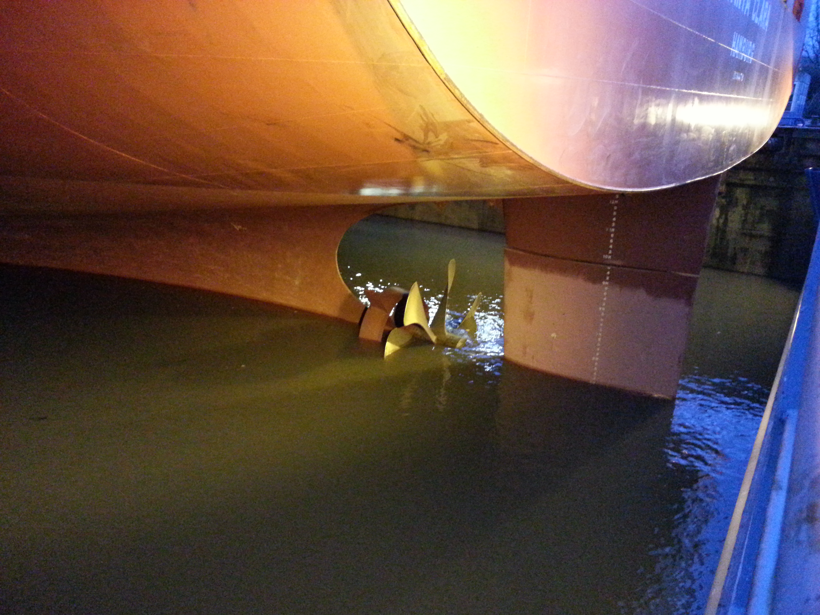 Ich machte noch einige letzte Fotos vom Schiff, unter anderem von Ruder und Schraube, die schon halb im steigenden Wasser lagen. Dann verließ ich die Werft, nachdem ich der Dame am Checkpoint mein Besucherformular zurückgegeben hatte (diesmal hatte ich es ausnahmsweise mal dabei).