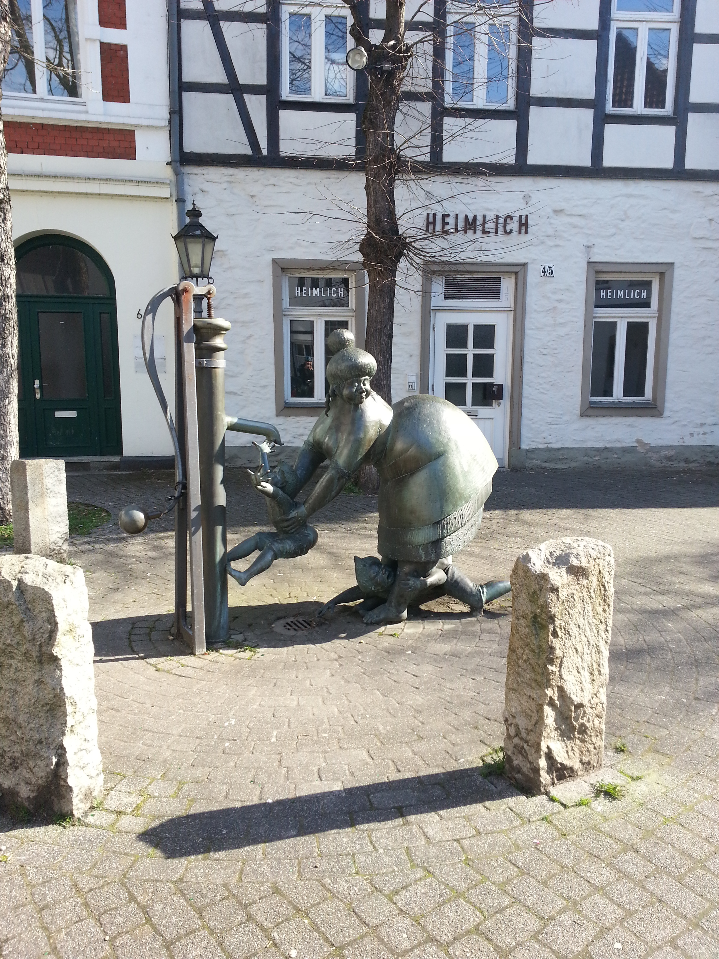 Diese Statue, die einen schwer gepanzerten Polizisten darstellt, steht an einer Brücke in der Hase. Auf Knopfdruck kommt ein Wasserstrahl, der auf den Platz am Knopf gerichtet ist, heraus.