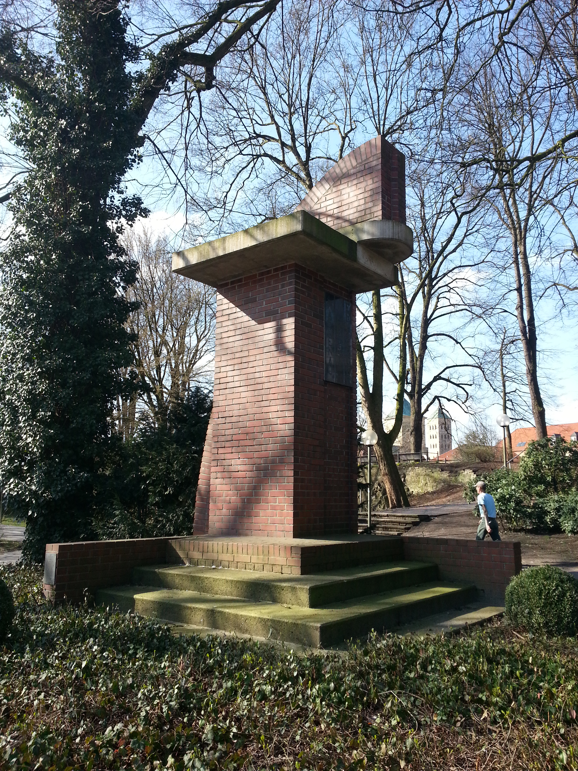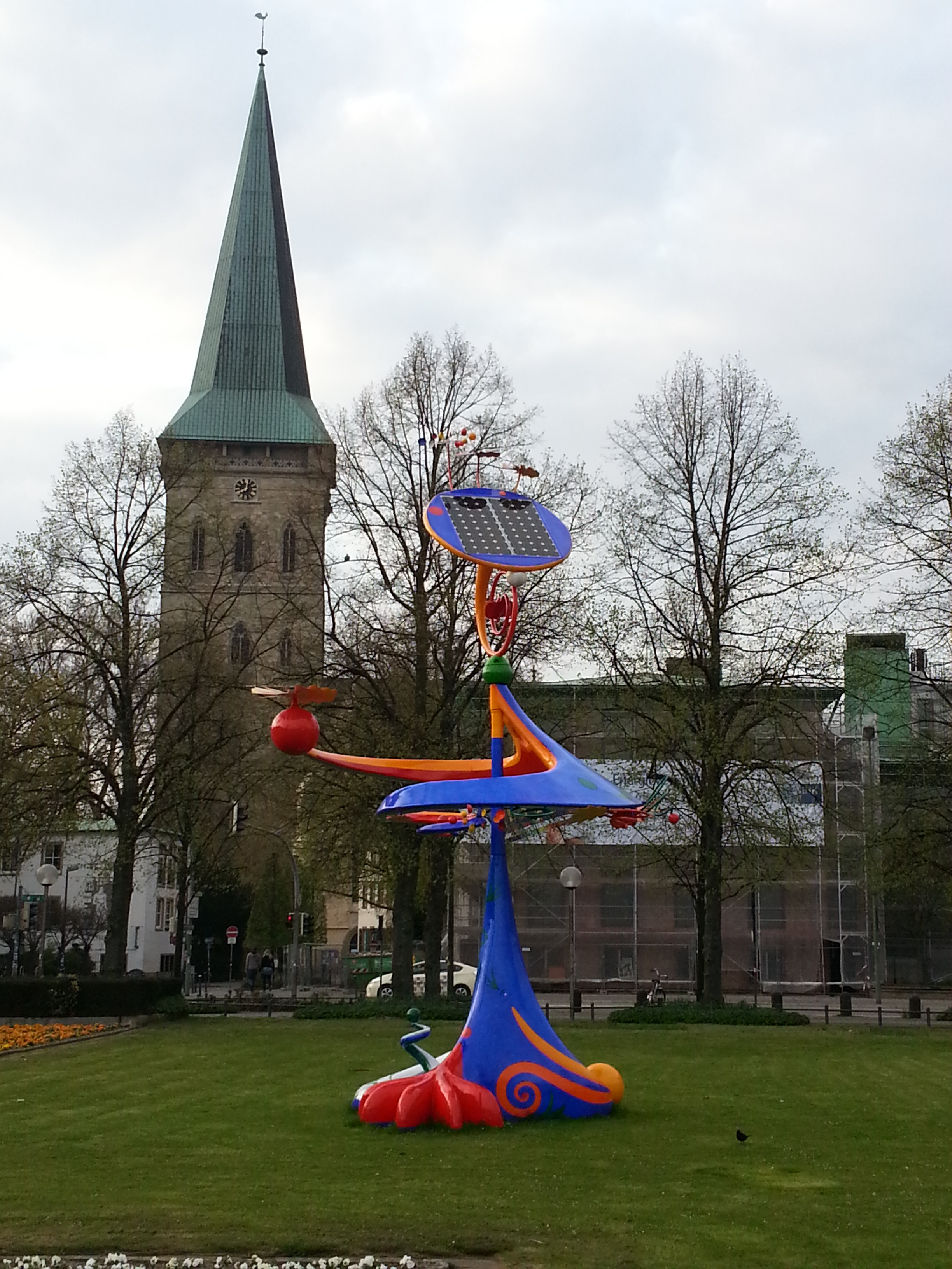 Dieses quietschbunte Werk steht im Schlossgarten, also an der Uni. Es heißt „Solara“ und rotiert mithilfe von Sonnenenergie. Ursprünglich nur eine Leihgabe der schweizer Künstlerin, wurde es auf eine Unterschriftenaktion (eine Initiative Osnabrücker Schulkinder) von der Stadt Osnabrück gekauft.