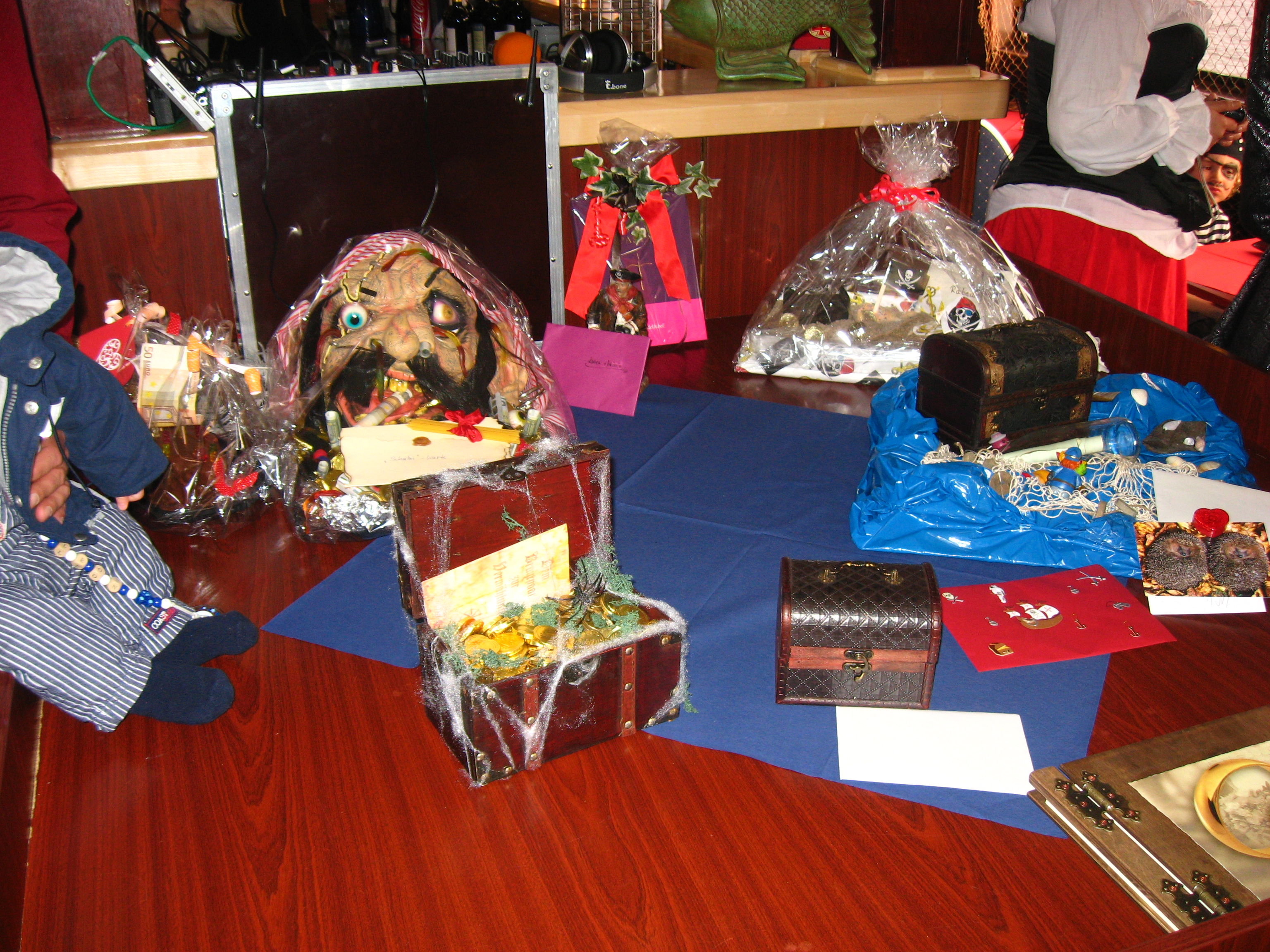 Das Buffett wurde eröffnet (es gab neben Fisch-, Fleisch- und Käseplatten mit Brot ansonsten Kartoffel-Gretain und zwei Sorten Fleisch, größere Mengen Spaghetti waren an Bord mitgebracht worden), die Band spielte mittelalterliche Musik (hm, das ist ja eher nicht so meins), später dann kam die Musik vom DJ. Geschenke wurden übergeben. In unserem Falle eine Schatzkiste mit Schokoladentalern und reichlich Hartgeld – offenbar sehr naheliegend, weil das sehr viele Leute gemacht haben. Unsere Truhe war immerhin mit einem gravierten Schloss gesichert, dessen Schlüssel es für das Brautpaar erst noch zu finden galt. Eine Schatzkarte dafür war in die Hochzeitskarte integriert.