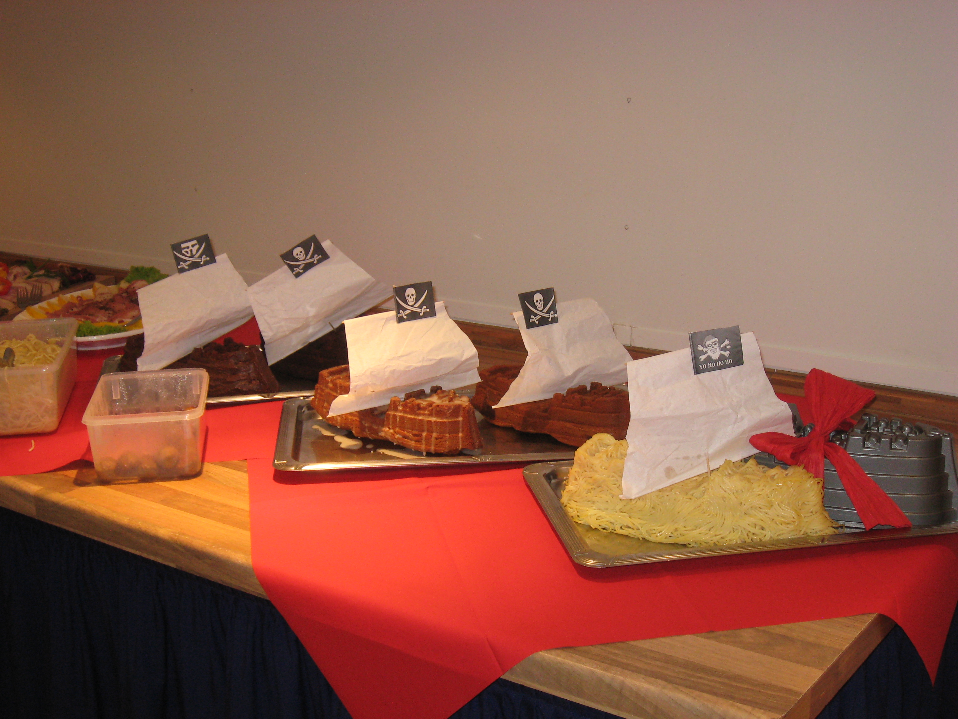 Statt einer Hochzeitstorte gab es eine gebackene Piratenflotte. Eines der Schiffe bestand aus Spaghetti. Die Fleischklößchen sind allerdings schon vom Brautpaar, der Trauzeugin und einer guten Freundin des Paares heruntergenascht worden. Ganz rechts mit Schleife: Die Backform zur künftigen Reproduktion wackerer Piratenschiffe.