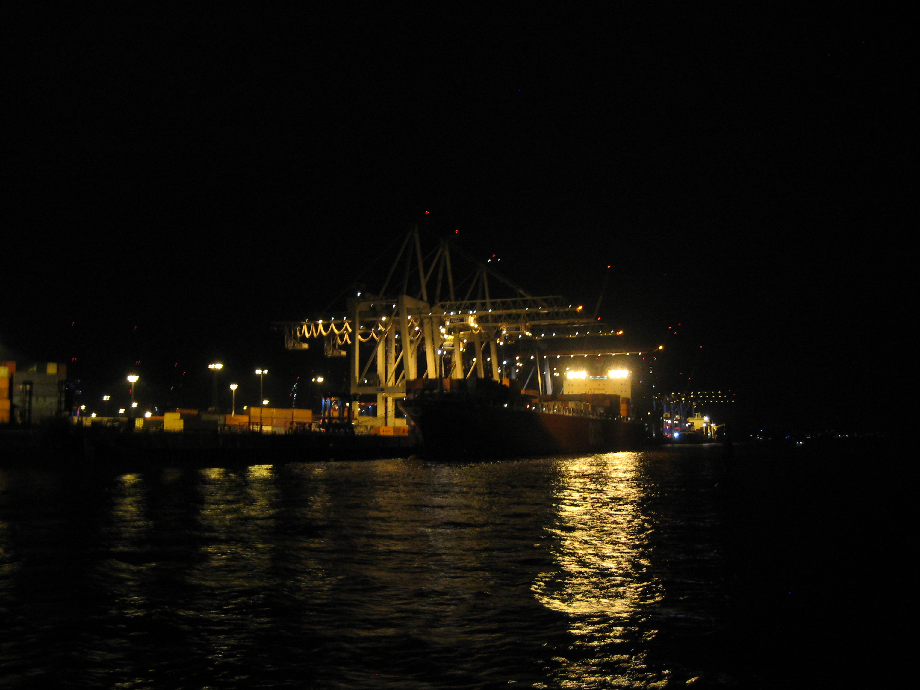 Nicht nur deswegen hielt ich mich hauptsächlich auf dem Oberdeck auf. Ich war zwar immer einmal wieder auf der Elbe unterwegs gewesen, von der klassischen Hafenrundfahrt als Kind oder Jugendlicher (wenn meine Eltern Besuchern Hamburg zeigten) über diverse Bootsfahrten mit einem Freund zu einer Kajak-Tour mit anderen Freunden. Aber es ist immer wieder schön, und ich war noch nie nachts bei Dunkelheit unterwegs gewesen, was einen ganz eigenen Charme hat. Zunächst fuhren wir elbabwärts, an Blankenese und den Airbus-Produktionshallen von Finkenwerder vorbei, in denen offenbar gerade vier A-380 für die Emirates endmontiert wurden. Bei Wedel wendeten wir und fuhren wieder zurück bis zu den Landungsbrücken. Hier startete dann eine ausgedehnte Tour durch verschiedene Hafenbecken. Es ging unter der Köhlbrand-Brücke her zum Hafengelände Altenwerder, wo das fast komplett automatische Terminal der HHLA liegt. Die Fahrt ging dann auch durch den Waltershofer Hafen an den Terminals von Eurogate und HHLA vorbei und zum Containerterminal Tollerort. Womit wir alle vier Containerterminals abgeklappert hätten. Es war faszinierend, zuzusehen, dem emsigen Laden, Löschen und Laschen zuzusehen. Emsig huschten Van-Carrier und andere Fahrzeuge mit zuckenden Gelblichtern über die Kais, während Containerbrückern mit fleißigen Laufkatzen die unscheinbaren 20- und 40-Fuß-Quader, die ein entscheidender Motor der Globalisierung sind, luden und löschten.