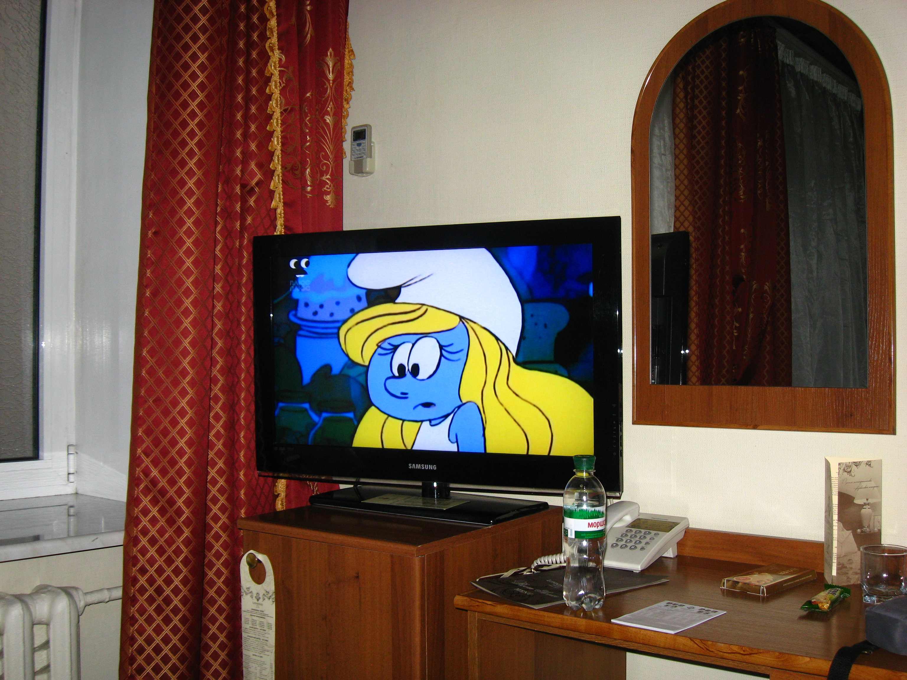 Ich brachte meine Einkäufen ins Hotelzimmer, öffnete ne Büchse Bier und machte die Glotze an. Auf dem Kanal, der als erstes auftauchte, lief eine Sendung über Bikinimodels, die sich bodypainten ließen. Hm, ist ja doch gar nicht so übel hier… Auf dem nächsten Kanal liefen allerdings gleich die Schlümpfe… die werde ich wohl nie los. Ich beschloss nach dem Studium der Menükarte, im Restaurant des Hotels zu Abend zu essen. Ich entschied mich für Boeuf Stroganoff und ein Borschtsch als Vorspeise. War auch beides sehr schmackhaft. Merken: Abneigung gegen Rote Beete überdenken.