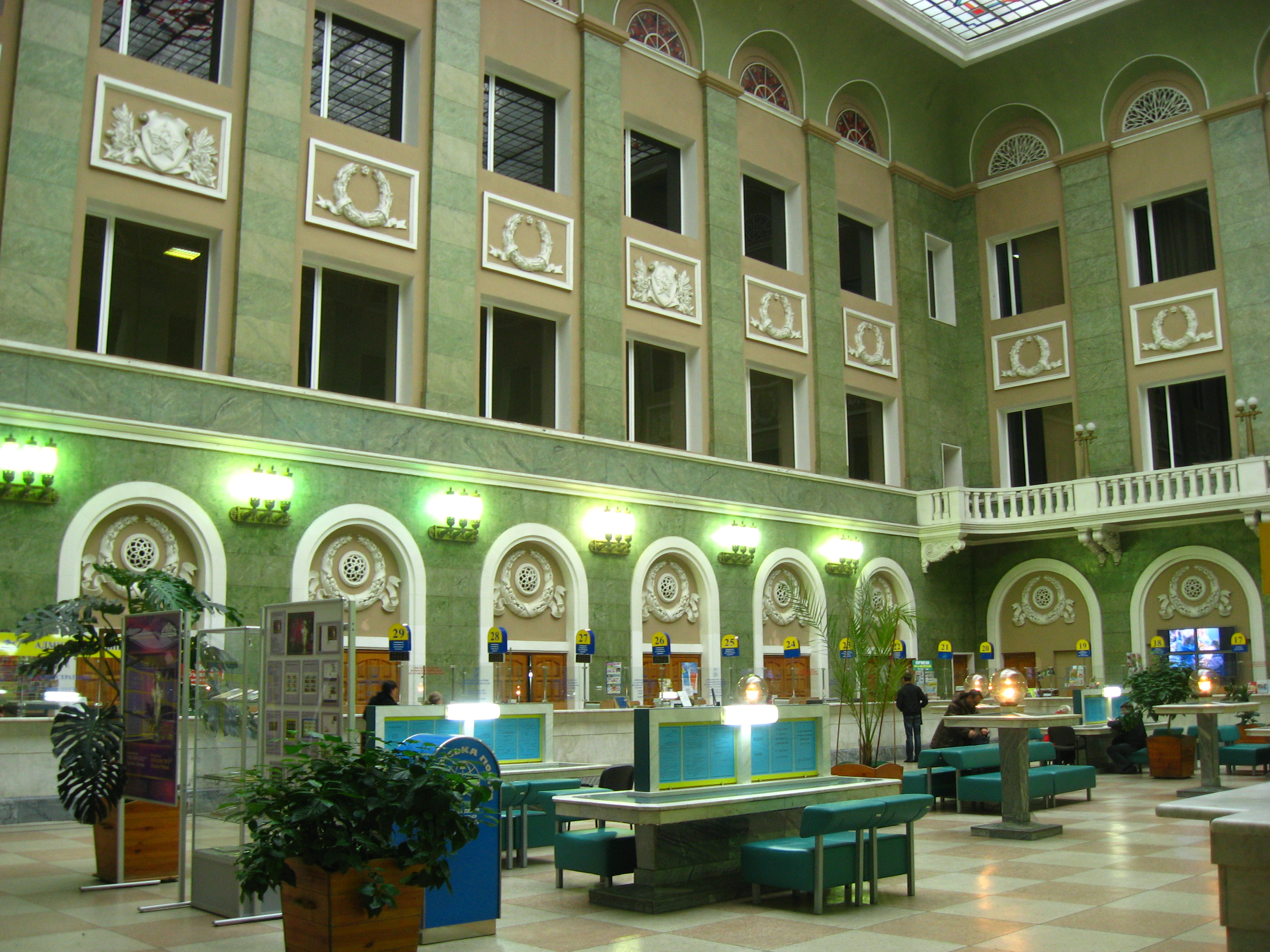 Ich ging also wieder die fünf Minuten in Gegenrichtung zur Post. Was für ein Prachtbau, sowohl von innen als auch von außen! Am Schalter erklärte ich einer jungen Dame mit Händen und Postkarten, was ich wollte, und sie verwies mich an einen anderen Schalter, da nochmal das Gleiche, und ich bekam meine 10 Marten im Wert von jeweil 4,80 Ocken. Danach setzte ich mich auf so eine Art Sofa und schrieb noch vier weitere Postkarten, so dass ich gleich sechs Karten vor Ort in den Kasten werfen konnte.