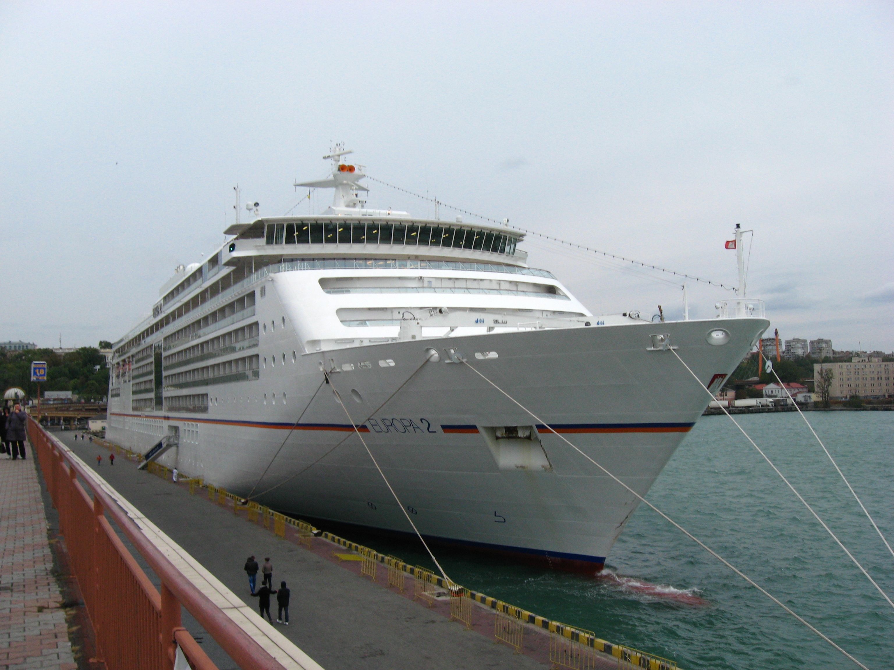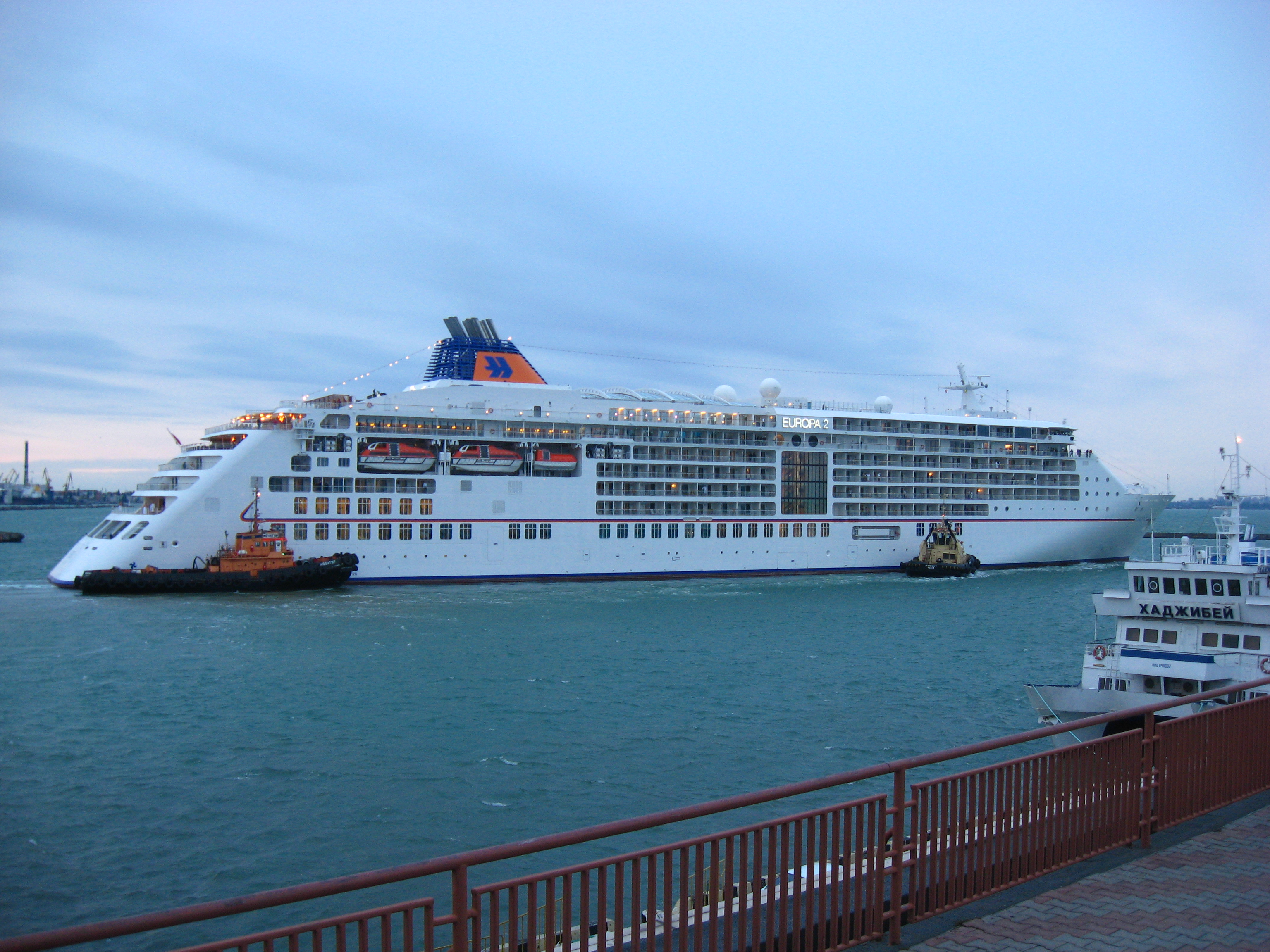 Die „Europa 2“ liegt größenmäßig nach Lüa und BRZ zwischen der „Silver Spirit“ und der „Celebrity Constitution“. Sie wirkt nicht ganz so gewaltig wie die „Constitution“ oder die „QE“, neben denen das Hotel Odessa klein aussieht.