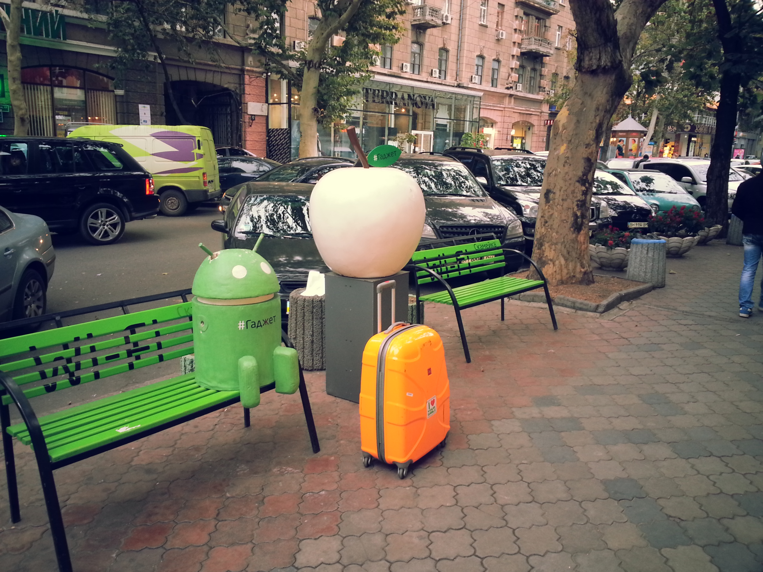 Android und Apple einträchtig beieinander – und meine quietschorangene Hartschale. Ist auch ein Ingress-Portal – also, Android und Apple, ohne meinen Koffer.