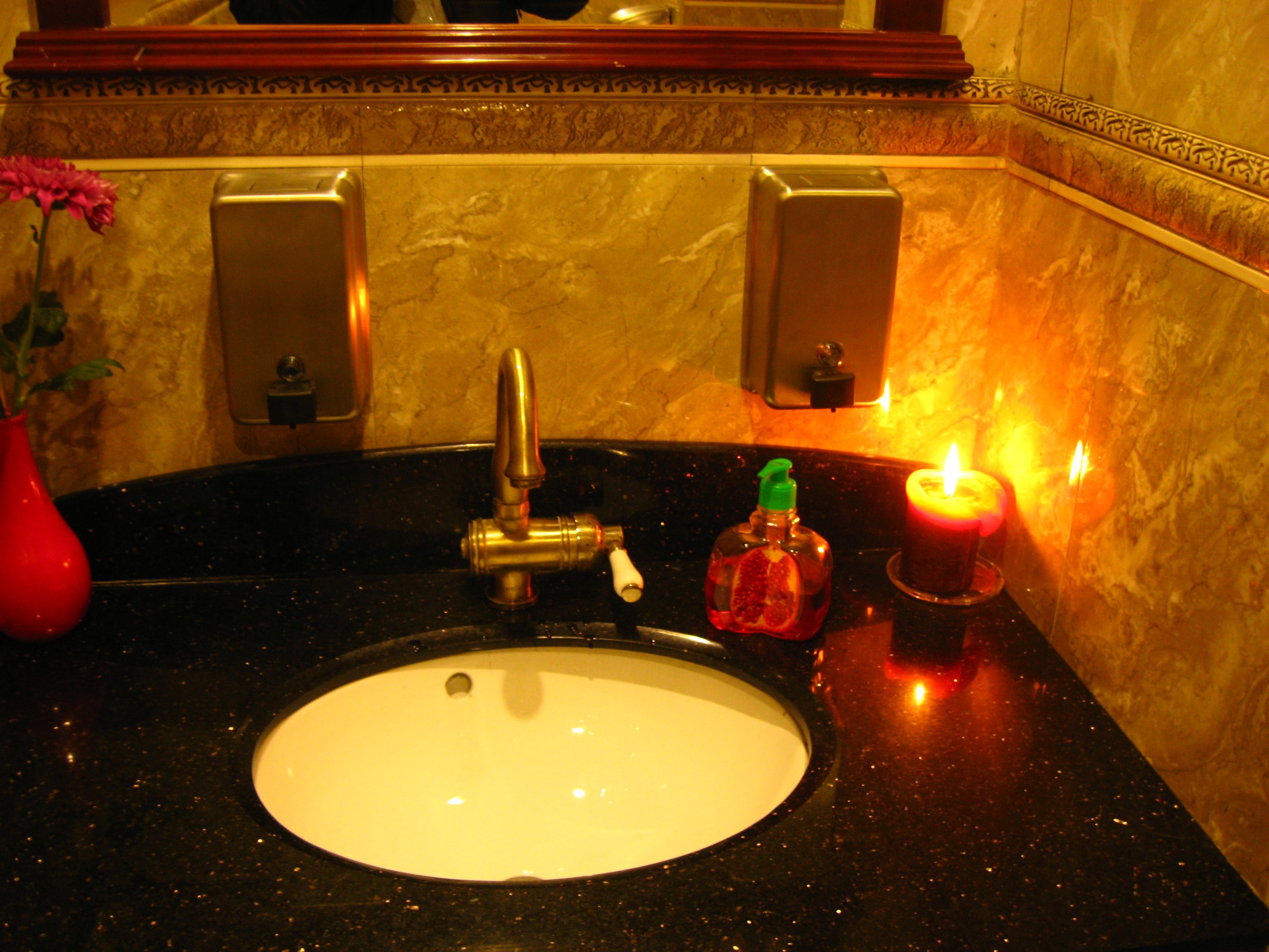 Es gibt aber für Herren exakt eine Toilette, die ist ein richtiges WC ohne Pissoir, dafür aber mit einer Kerze am Waschbecken. Und mit einer Art „Wartezimmer“: Ein plüschiges Diwan steht vor einer Wand mit Flachbildfernseher, auf einem Tischchen liegen Magazine und eine Schale mit Bonbons steht bereit. Das hat einfach Stil.