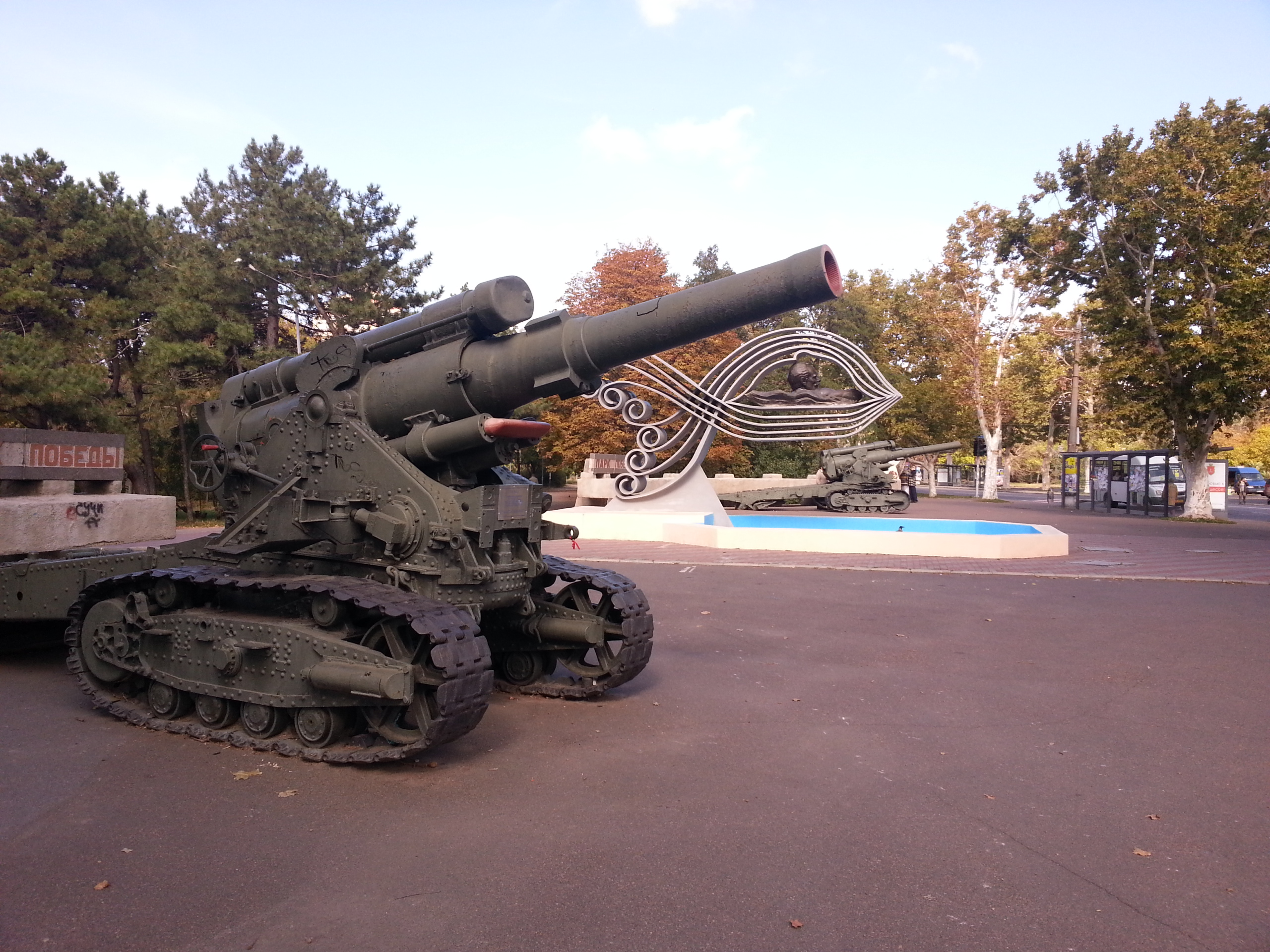 Noch ein Geschütz, schick mit Weißwandreifen. Ganz wichtig ist, dass die Parkeingänge gut durch großkalibrige Artillerie geschützt sind. Bei dem jugendlichen Sprayer- und Skater-Gesindel, welches seit dem Fall des eisernen Vorhangs die Vorstädte hier unsicher macht… Dieser späte Sieg des westlichen Imperialismus muss mit allen Mitteln verhindert werden!
