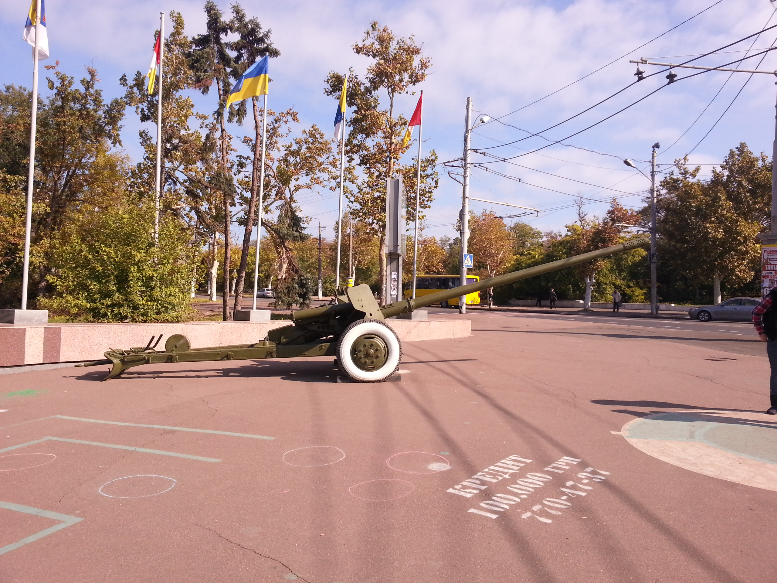 Ähm. Ich bin nur ein ganz bisschen abgeschweift. Musiklos aber Planvoll schleifte ich meinen Koffer Richtung Hotel. Irgendwann änderte sich das Stadtbild. Die Gebäude worden immer moderner und höher. Ich kam an mehreren großen Grünanlagen vorbei. Und an diversen Geschützen, die an den Eingängen zu den Parks aufgebaut waren. Auf dieser Seite des ehemaligen, eisernen Vorhangs steht man den Amerikanern darin, Gebrauchtwaffen überall in der Gegend herumstehen zu lassen, in keiner Weise nach.