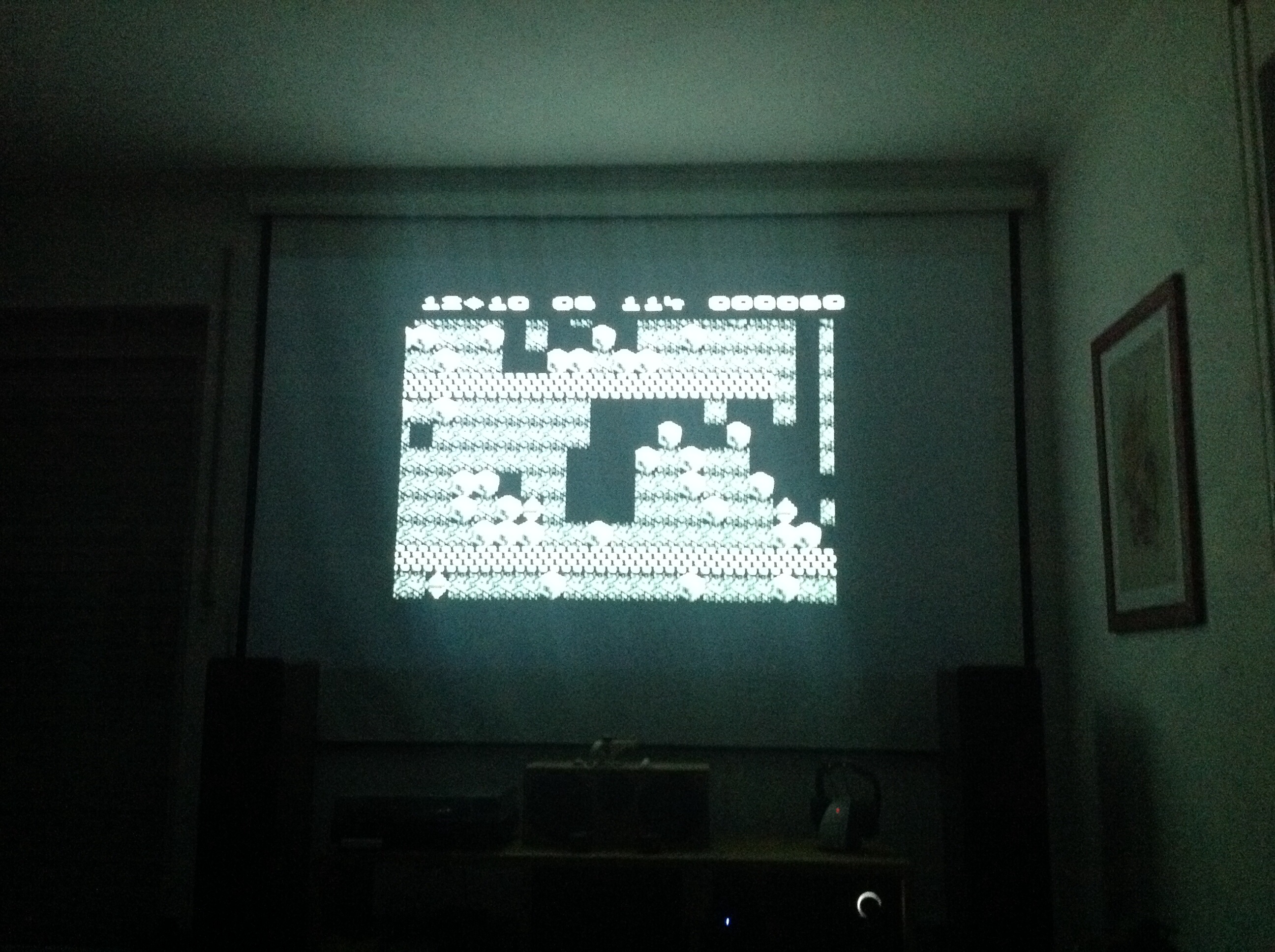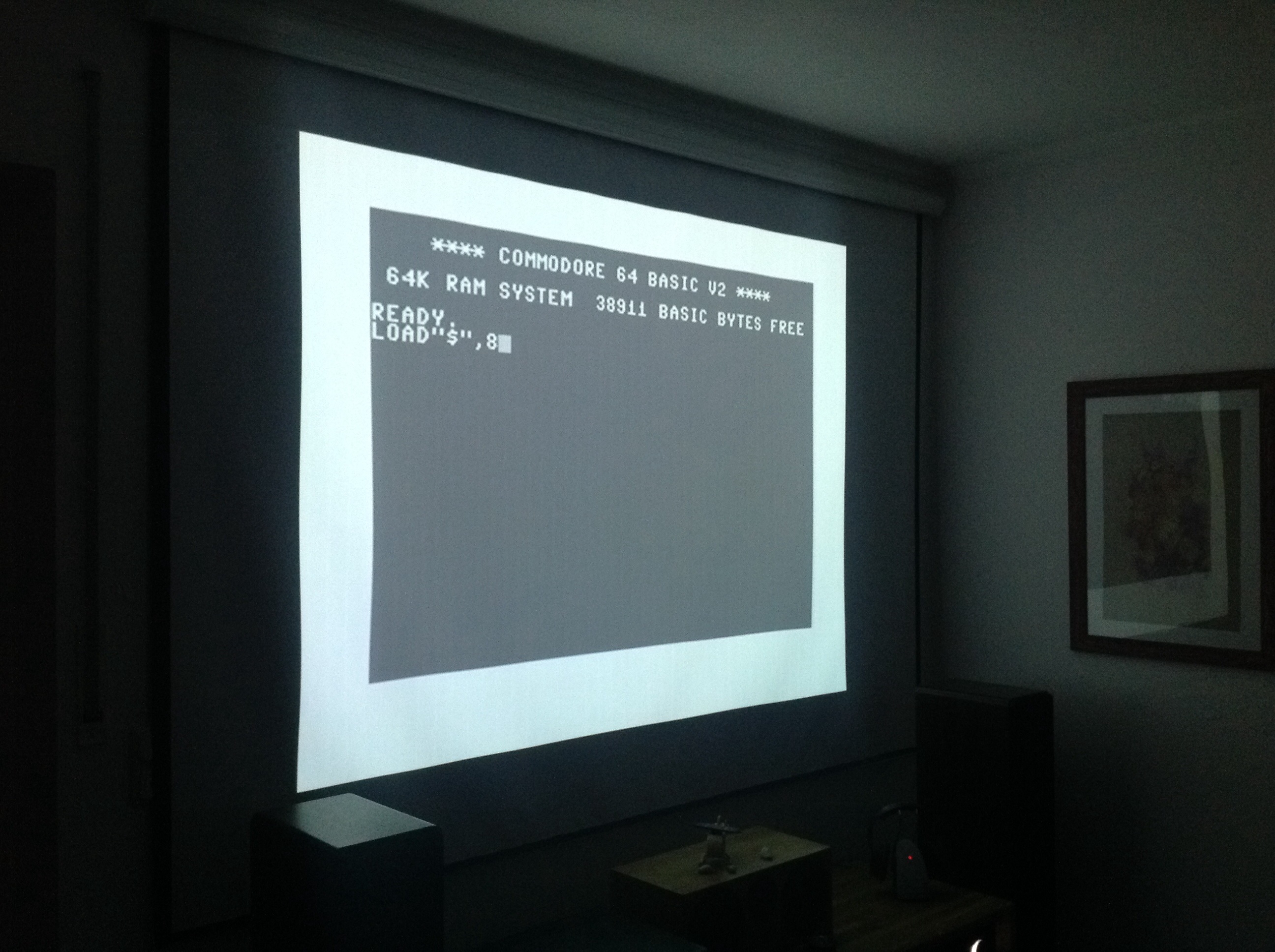 Zunächst war zu untersuchen, welche Teile des Hardwaremuseums denn womöglich noch einsatzbereit wären. Eine der beiden „Brotdosen“, wie der C64 liebevoll weiland genannt wurde, sowie das neuste Diskettenklaufwerk vom Typ 1541 II taten es noch. Also wurden die alten Schätze samt zwei Joysticks, Netzteilen und sonstigem Kabelsalat ins Wohnzimmer verfrachtet und mit dem Beamer und der Dolby-Digital-Anlage verdrahtet. Hm… war das Bild nicht eigentlich farbig? Es ist wohl entweder dem DIN-Cinch-Adapter für Composite-Video und Ton, oder der Anschlussbuchse des Homecomputers geschuldet, dass wir nur ein Schwarzweißbild zu sehen bekamen. Naja… umso mehr Retro war es halt…