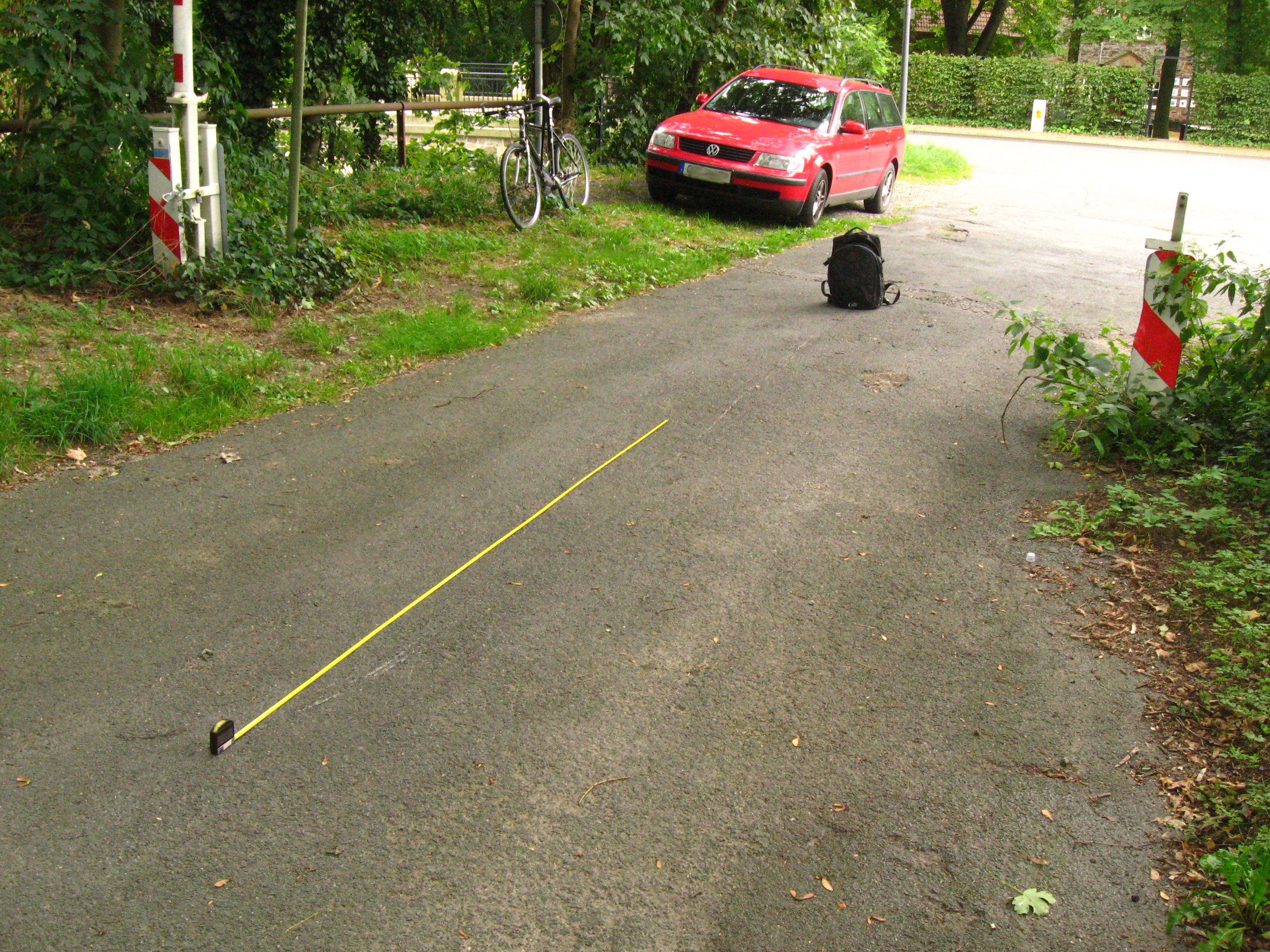 Der Beginn des auf drei Meter ausgefahrenen Maßbandes markiert den Anfang, der Rucksack das Ende der Schleifspur