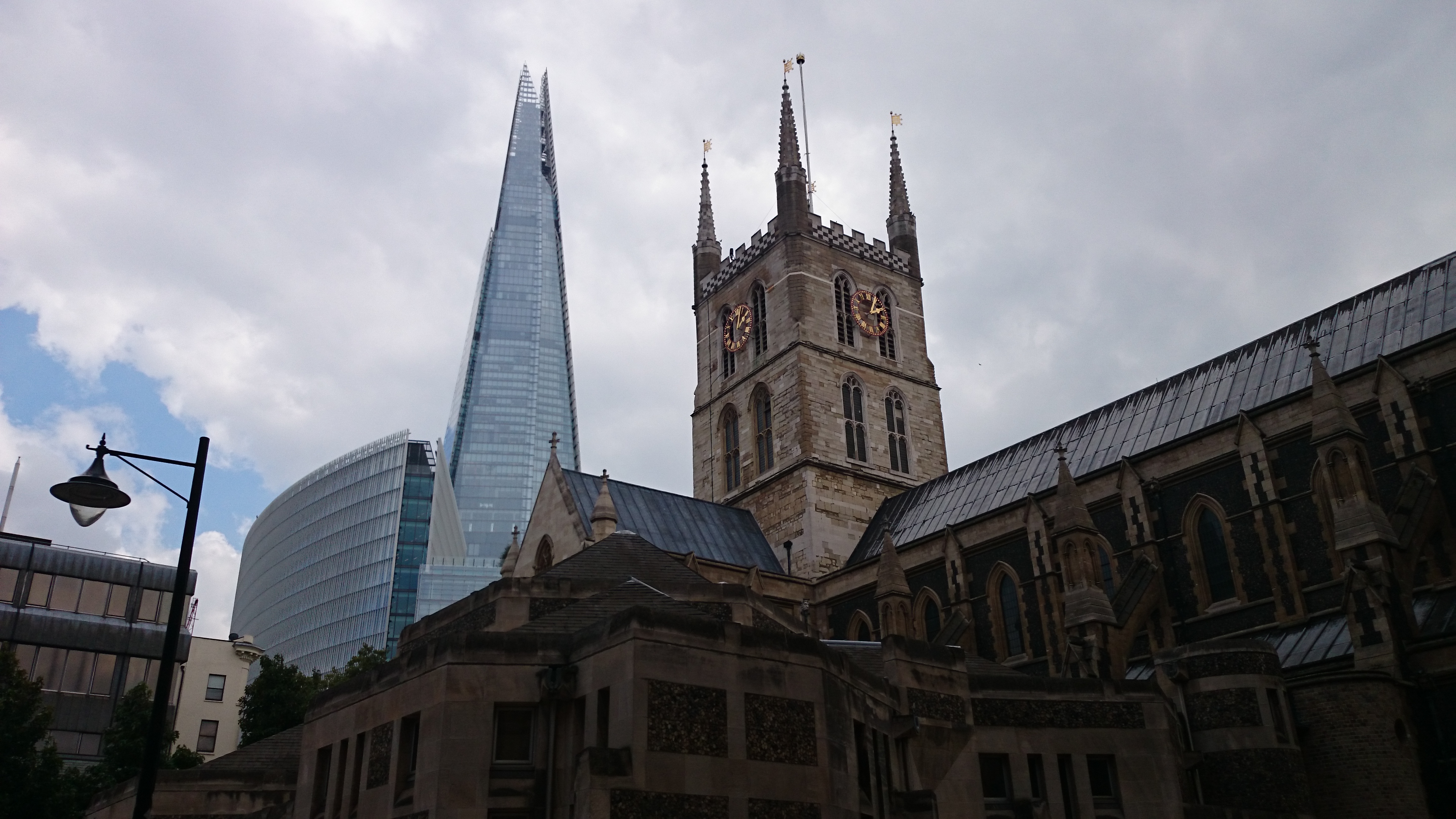 Hier wieder eine von Londons typischen Alt/Neu-Mischungen: „The Shard“ (links) und Southwark Cathedral (rechts).
