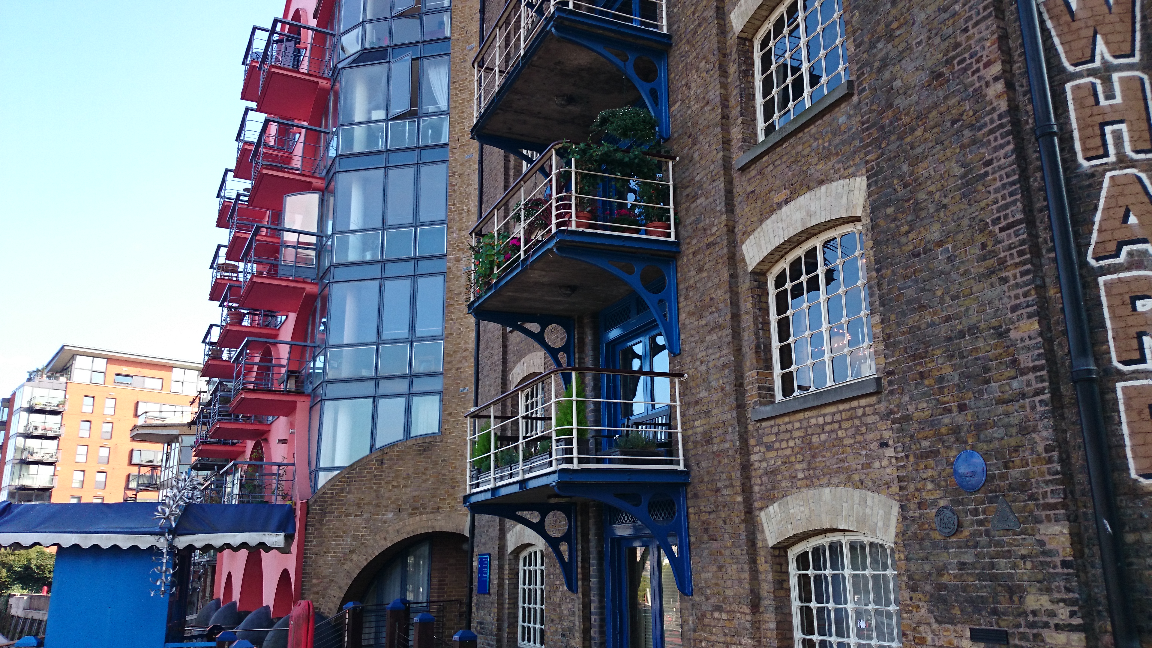 Weiter ging es an der Hays Gallery und der etwa halbkugelförmigen, vollverglasten City Hall vorbei. Der Boris hat schon einen eindrucksvollen, wenngleich etwas seltsamen Bürokomplex hier. Ich kam zur Tower Bridge und unterquerte sie erstmal, um weiter das Themseufer entlangzuwandern. Ich überquerte eine Art kurzen Nebenarm (ich weiß nicht, wie ich das sonst nennen soll) der Themse und gelangte zu einem großen Wohngebäude mit ansprechenden Balkonen mit Flußblick. Man kann schon sehr nett wohnen… wenn man es sich leisten kann.