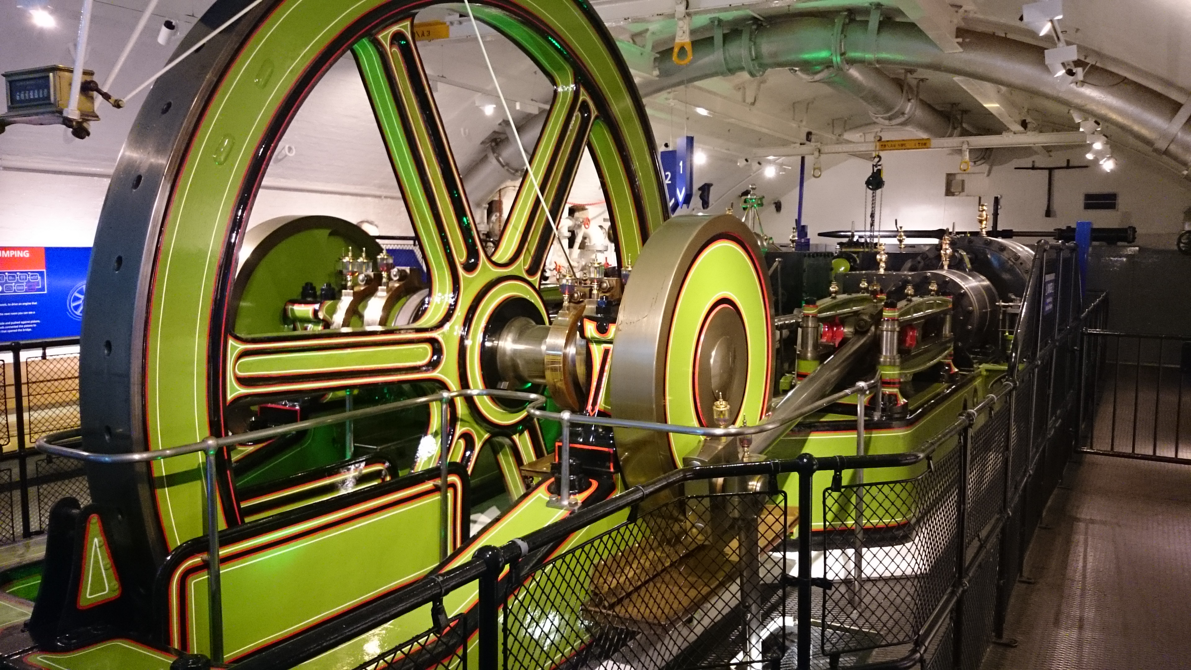 Ich ging über die Treppe den Südturm runter (und nutzte die Chance, hier einen Restroom zu nutzen) und gelangte dann unten angekommen in den Engine Room. Hier waren die ursprünglich zum Heben der Brückenflügel (der Baskülen, wie man dazu sagt, weiß ich auch erst seit gestern) verwendeten Dampfmaschinen untergebracht und zu besichtigen. Schautafeln verdeutlichten das technische Prinzip von der Kohleanlieferung über die Themse bis zum Öffnen der Brücke. Mit der Kohle wurden Dampfkessel befeuert, um Dampfdruck zu erzeugen. Dieser speiste in der Regel eine von zwei Dampfmaschinen (damit während Wartungsarbeiten an einer Maschine die Brücke weiterhin betrieben werden konnte). Die Dampfmaschinen betrieben Hydralikpumpen, die Hydraulikdruck erzeugten (tatsächlich noch mit Wasser, nicht mit Hydrauliköl). Dieser wurde genutzt, um dann an den Baskülen (der Maschinenraum war am Ufer) Hydraulikmotoren (Kolbenmotoren mit automatischer Ventilsteuerung) anzutreiben, die über ein Untersetzungsgetriebe die Baskülen öffneten und schlossen. Außerdem konnte Hydraulikdruck in zwei gewaltigen Akkumulatoren gespeichert werden, zwei riesigen Kolben, die in einem eigenen Turm durch den Druck in die Höhe geschoben wurden. Wenn die voll „geladen“, also ganz oben waren, konnte mit deren Hilfe einfach per Schwerkraft die Brücke geöffnet werden. Das hydraulische System war notwendig, weil die Dampfmaschinen selbst zu groß waren, um direkt bei den Baskülen in die Brücker eingbaut zu werden. Die Hydraulikmotoren hingegeben waren kompakt genug und Hydraulikdruck das ideale Mittel der Leistungsübertragung inkl. des Energiespeichersystems der Akkumulatoren. Ich war echt ziemlich begeistert von dieser genialen Konstruktion, die zu ihrer Zeit High-Tech war. Die Ausstellung war die neun Pfund absolut wert. Wahrscheinlich war die Sache vergleichsweise günstig, weil die Brücke nach über hundert Jahren inzwischen bezahlt ist („The Shard“ aber vielleicht noch nicht…)