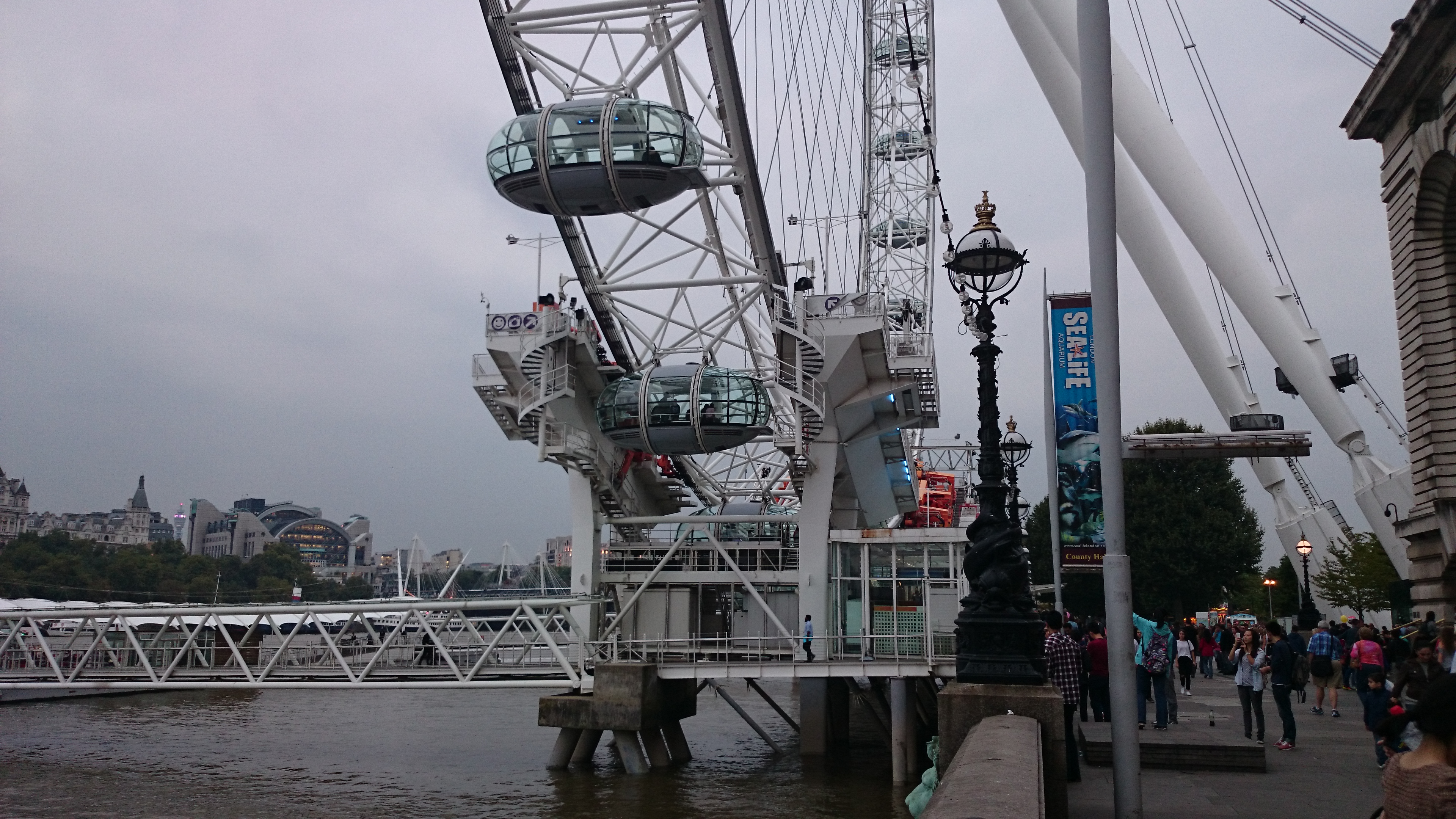 Wie auch immer, ich überquerte einmal mehr die Themse über die Westminster Bridge und ging Richtung Riesenrad. Wow – das hier war eine richtige Tourifalle. Hier gab es neben dem London Eye noch andere Fahrgeschäfte, das Sea Life Aquarium und die County Hall mit Bowling, Spielautomaten, Arcardegames, Fastfoodrestaurants etc. Ich besah mir das Riesenrad aus der Nähe, welches ich schon in einigen Spielfilmen gesehen hatte, z.B. mussten da die Insassen von den „Fantastic Four“ mal vor dem Silver Surfer gerettet werden oder sowas in der Art. Weiß ich nicht mehr so genau, ich muss mir den Film wohl nochmal ansehen. Auf jeden Fall drohte das Ding umzukippen und in die Themse zu fallen. Okay, angetrieben wird das Ding wie das Standard-Volksfest-Riesenrad über Reibradantrieb, vermutlich auch wie allgemein üblich mit Hydraulikmotoren (die Tower Bridge läßt grüßen). Besonders ist allerdings die freischwebende Radnabe an zwei diagonalen Streben, die von Stahlseilen gehalten werden. Ist schon eine kühne Konstruktion.
