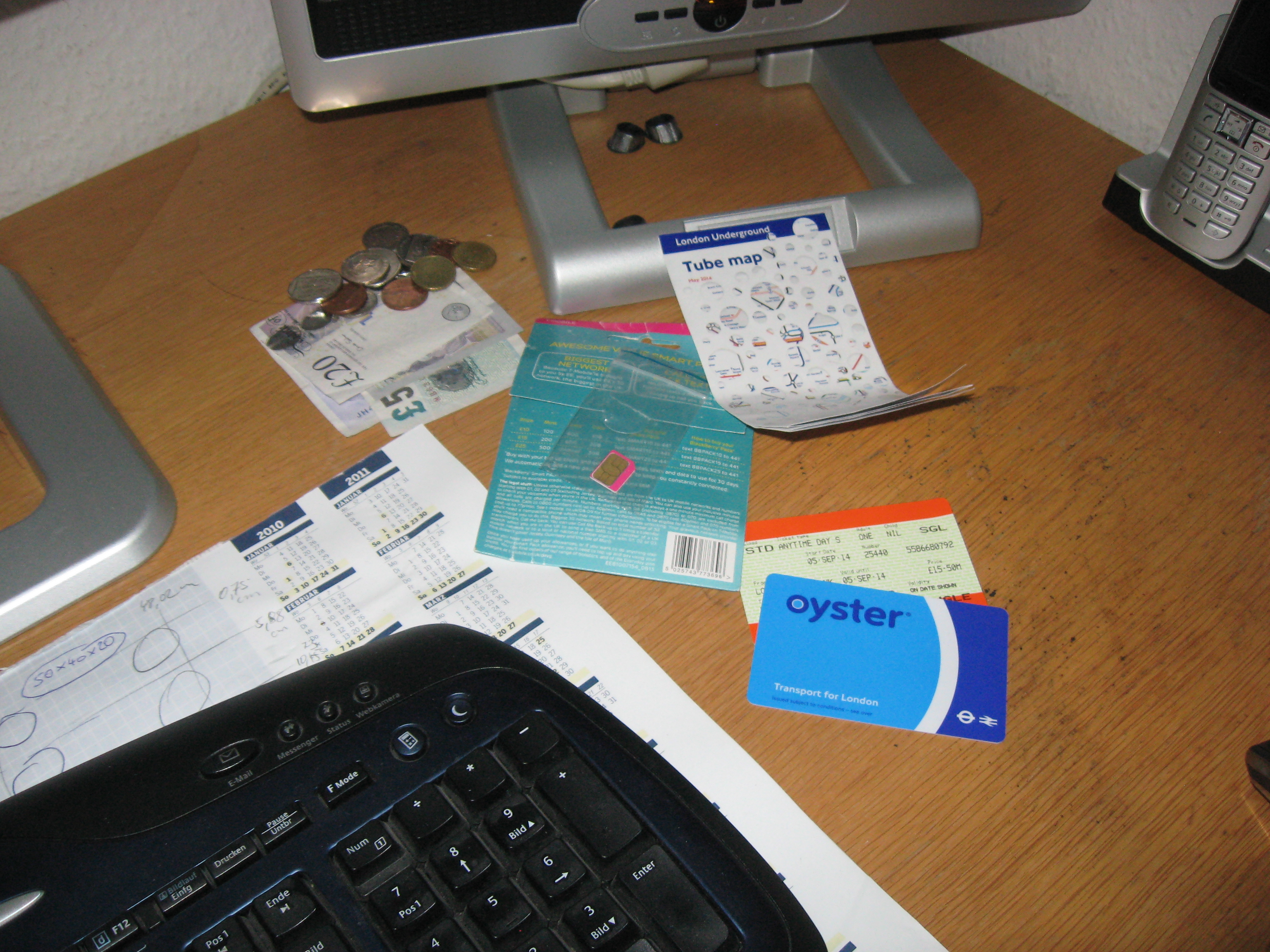 Was von London übrig blieb: 25 Pfund und paar Cents, ne SIM-Card (nur etwa ein halben Gig Datenvolumen verbraucht), eine Tube Map, Bahnticket nach Luton und die Oyster Card mit einer unbekannten, noch nicht verbrauchten Restsumme.