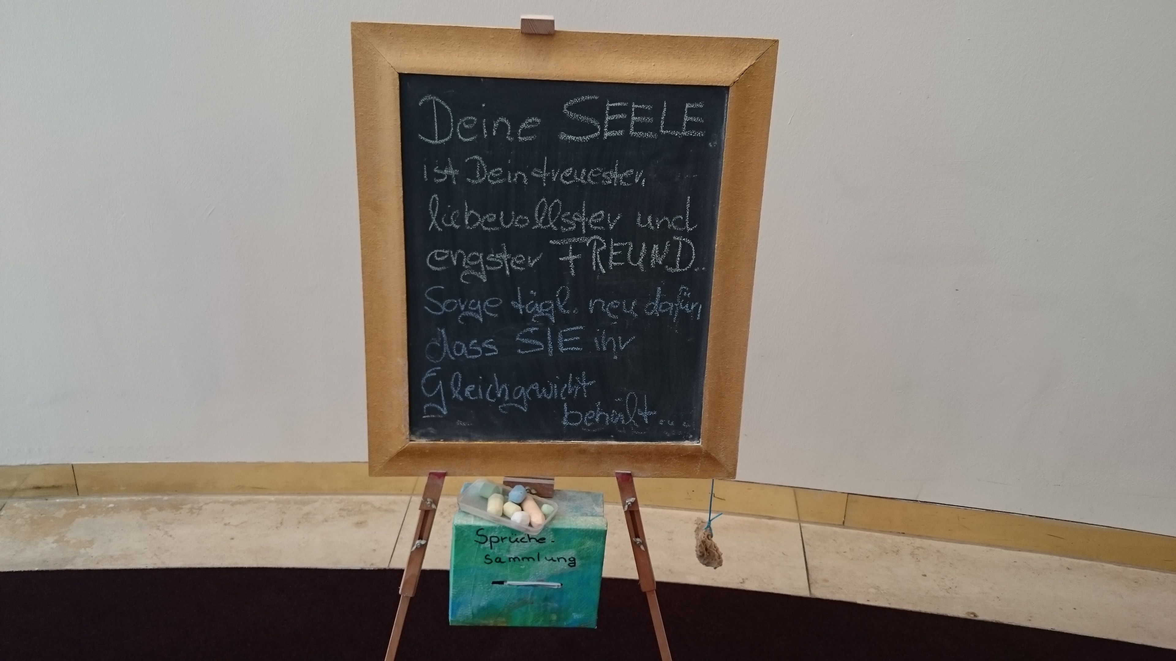 Ein Sprüchlein auf dem Flur. Wechselt bestimmt häufig. Die Tafel haben womöglich Patienten im Rahmen der Gestaltungstherapie gebaut, könnte ich mir zumindest vorstellen.