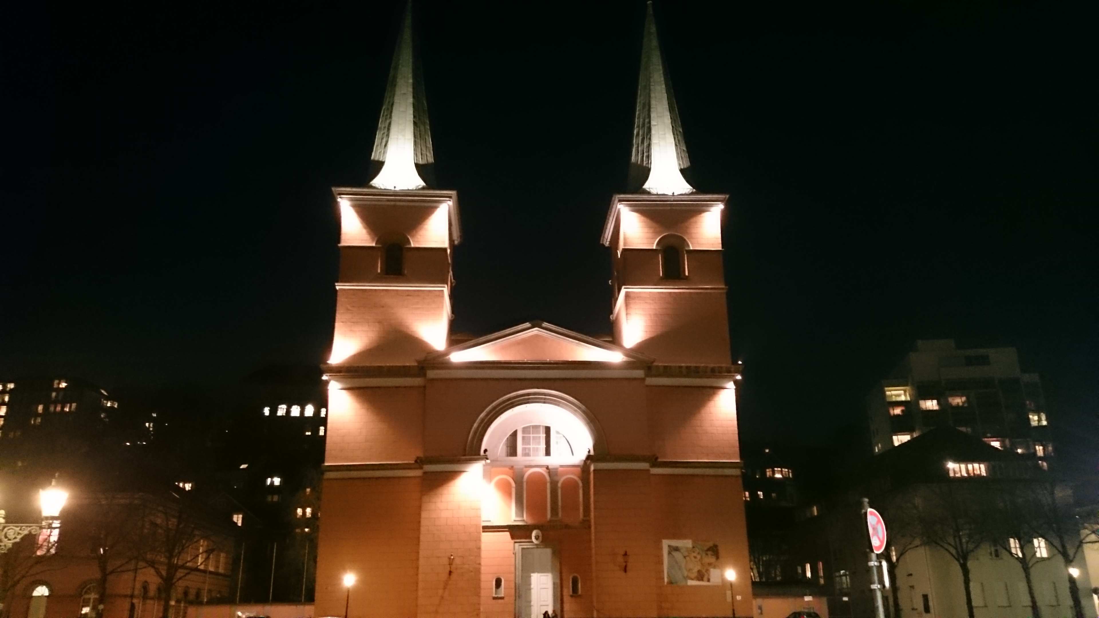 Das Ding war mit einer Dauer von einer Stunde angegeben, eine reine Hacker-Mission. Aber es waren eine Menge Portale, und da ich nicht immer nur hackte, sondern die Portale auch einnahm, dauerte es länger als eine Stunde. Ich gelangte dabei dann zu der Kirche… die in Google Maps offenbar nicht eingezeichnet ist und deren Namen ich vergessen habe. Grrr! Wie auch immer, es war schon dunkel, ich zog auf der Mission um die Häuser, und es war schon so eine Sache, bis ich das endlich – wieder in der Nähe der St. Laurentius – Kirche – fertig hatte. Also wieder zurück ins Stadtzentrum Richtung Hauptbahnhof, weitere 8er-Portale knacken.