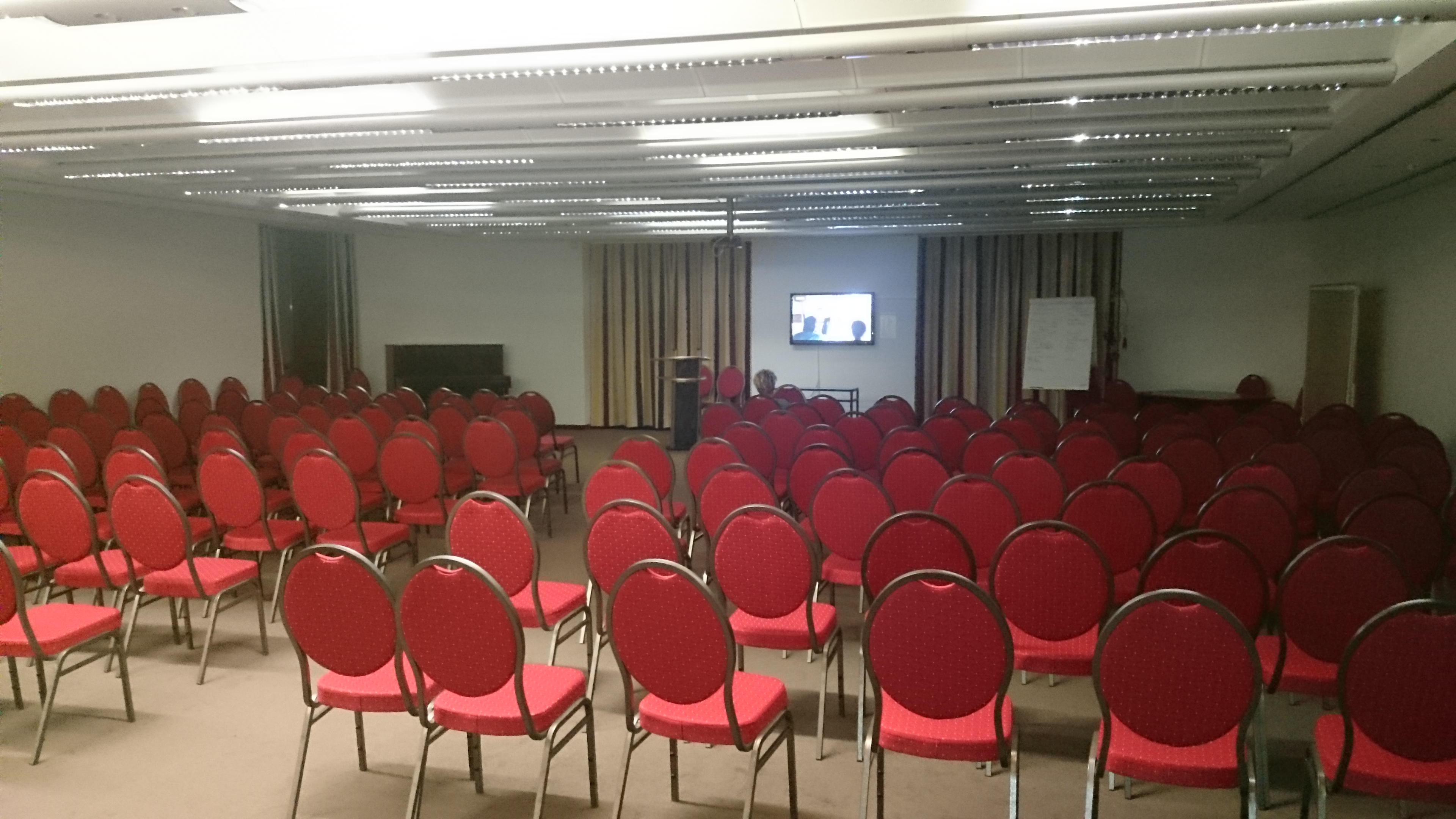 Der Vortragsraum. Hier finden die Vorträge und die Patientenforen statt. Man kann ihn aber auch zum musizieren nutzen (was auch schon gemacht wurde, es gibt ein Klavier und ein Cachon hier), oder zum fernsehen. Gerade schaut hier eine einsame Dame RTL.
