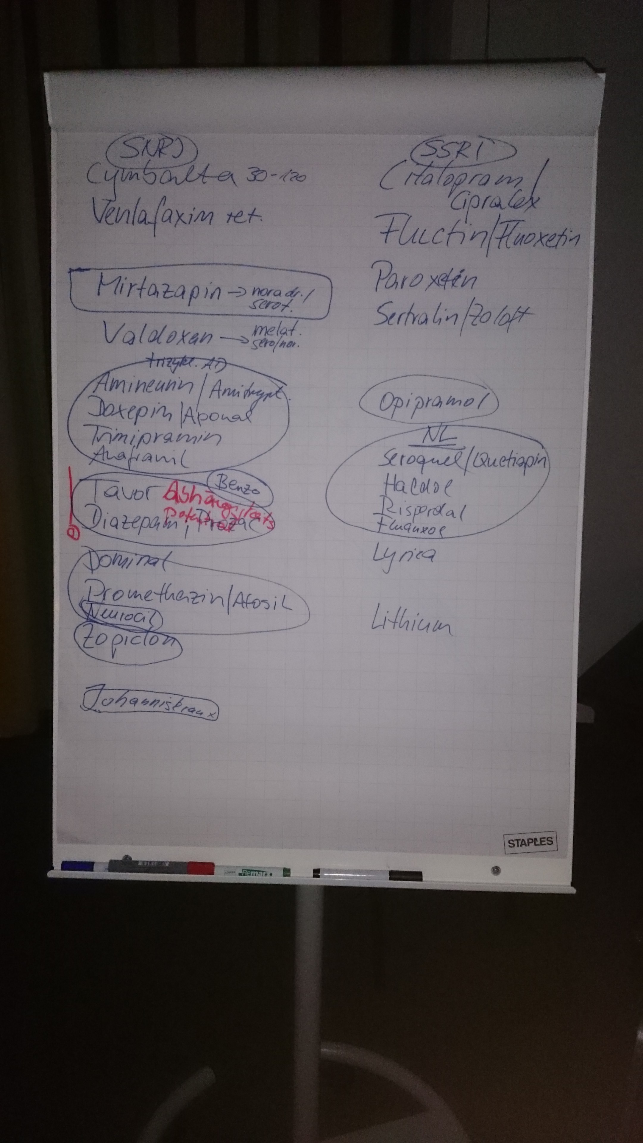 Wie auch immer, das war keine „Depressionsgruppe“, sondern ein Vortrag. Es ging um Medikamente, natürlich insbesondere Antidepressiva. Die Vortragende arbeitete ohne Beamer und Powerpoint, sondern mit einem Flipchart. Zuerst ließ sie das Auditorium alle möglichen Psychopharmaka-Namen in den Raum werfen, die sie in Gruppen unterteilt, an den Flipchart schrieb. Was da alles zusammen kam… eine ganze Menge. Mirtazapin, Valdoxen, Doxepin, Trimipamin, Venlafaxin, Citalopram, Opipramol, nur um ein paar zu nennen. Man mag die Fachleute für Namensfindung von IKEA-Möbeln (gibt es da wohl eine Ausbildung in die Richtung? „Fachwirt für Raumausstatungs-Nomenklatur“ oder so?) für ihren nie enden wollenden Strom an Regal-Neologismen bewundern, die Pharmaindustrie braucht sich da nicht zu verstecken! (Mein Sprüchlein „Die sind ja schlimmer als IKEA!“ erntete im Audiotorium auch einiges an Gelächter.)
