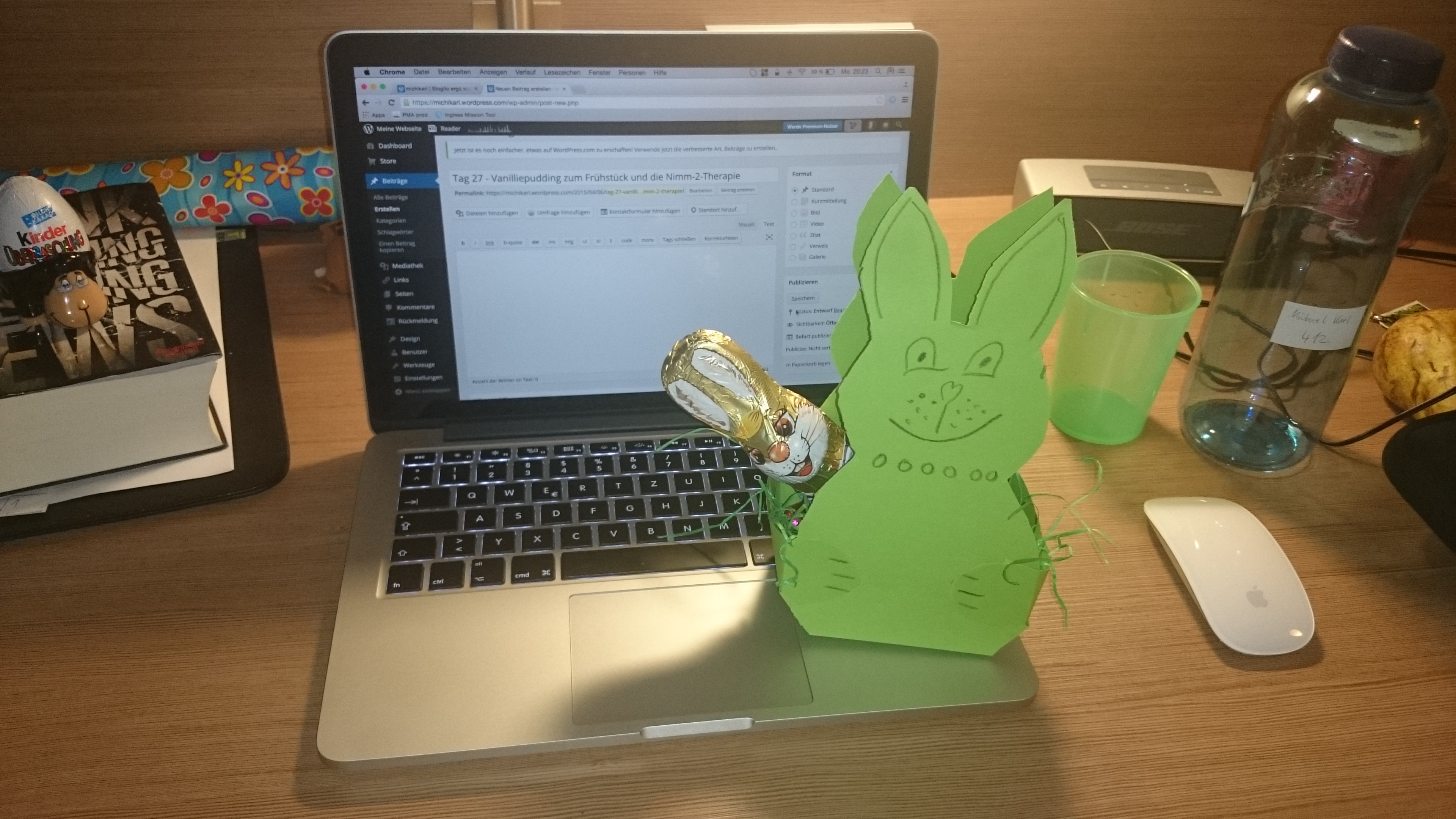 Tja, da hat eine fleissige Ergo-Therapeutin eine Menge Hasen für uns gebastelt. Und es ist sogar ein Schoko-Artgenosse darin…