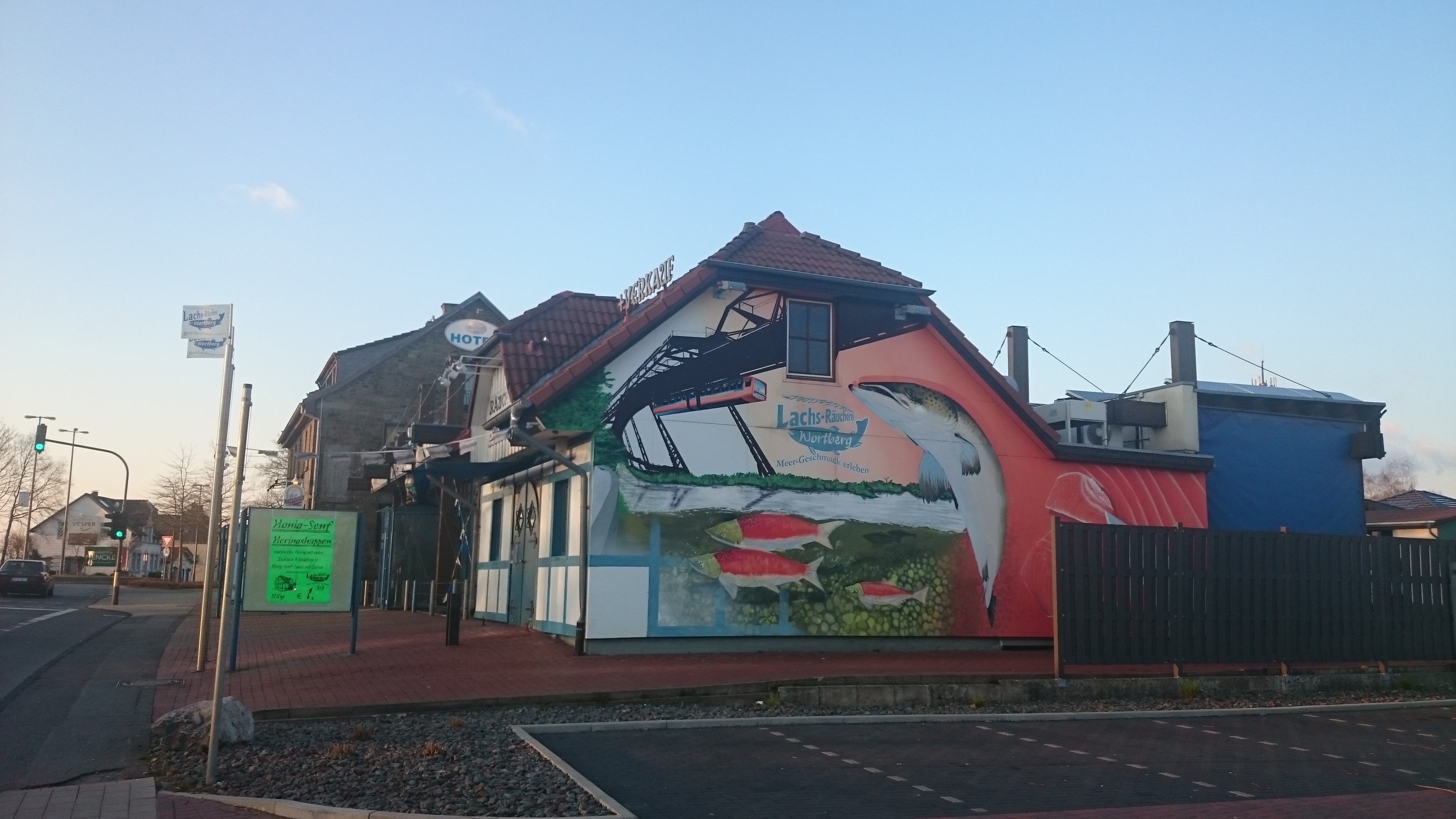 Die Aal-Kate mit einer künsterlischen Darstellung der Wupper, der Schwebebahn und ein paar Fischen. Ich weiß nicht, wie es mit den Fischen aussieht, aber Wupper und Schwebebahn sind ein wenig idealisiert dargestellt…