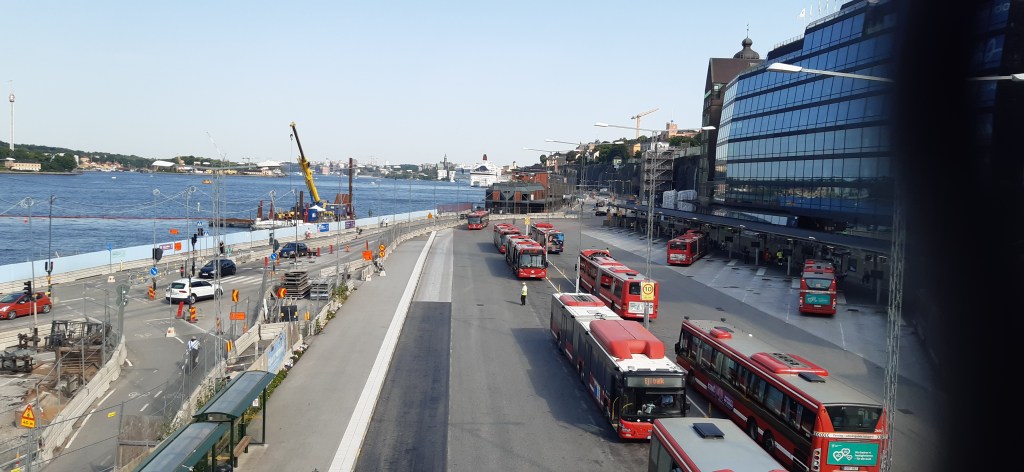 Das war zwar verlockend, aber ich ging weiter … vielleicht auf dem Rückweg… Irgendwann hatte ich Södermalm komplett durchquert und landete wieder auf einer Brücke, der Skanstullsbron. Die Gegend sah nun eher fast schon industriell aus. Trotzdem überquerte ich die Brücke noch. Auf der anderen Seite, südlich von Södermalm, gab es dann einen großen S-Bahnhof, und ich überlegte, ob ich von hier mit der Bahn zurück nach Norrmalm fahren sollte. Aber irgendwie fand ich den Zugang zum Bahnhof nicht von meinem Weg aus und kehrte schließlich um. Zurück in Södermalm kaufte ich noch etwas ein und entschied mich dann, von der Bahnstation Skanstull zurück zum Hauptbahnhof zu fahren. Es war das erste und wird wohl auch das einzige Mal sein, dass ich bei diesem Besuch die S-Bahn benutzte, also kaufte ich mir nur einen Einzelfahrschein. Die vierte Station war dann schon der Bahnhof. Von dort ging ich dann – mit einem Abstecher zu McDonald’s – zurück ins Hotel, wo ich dann diese Zeilen tippte.