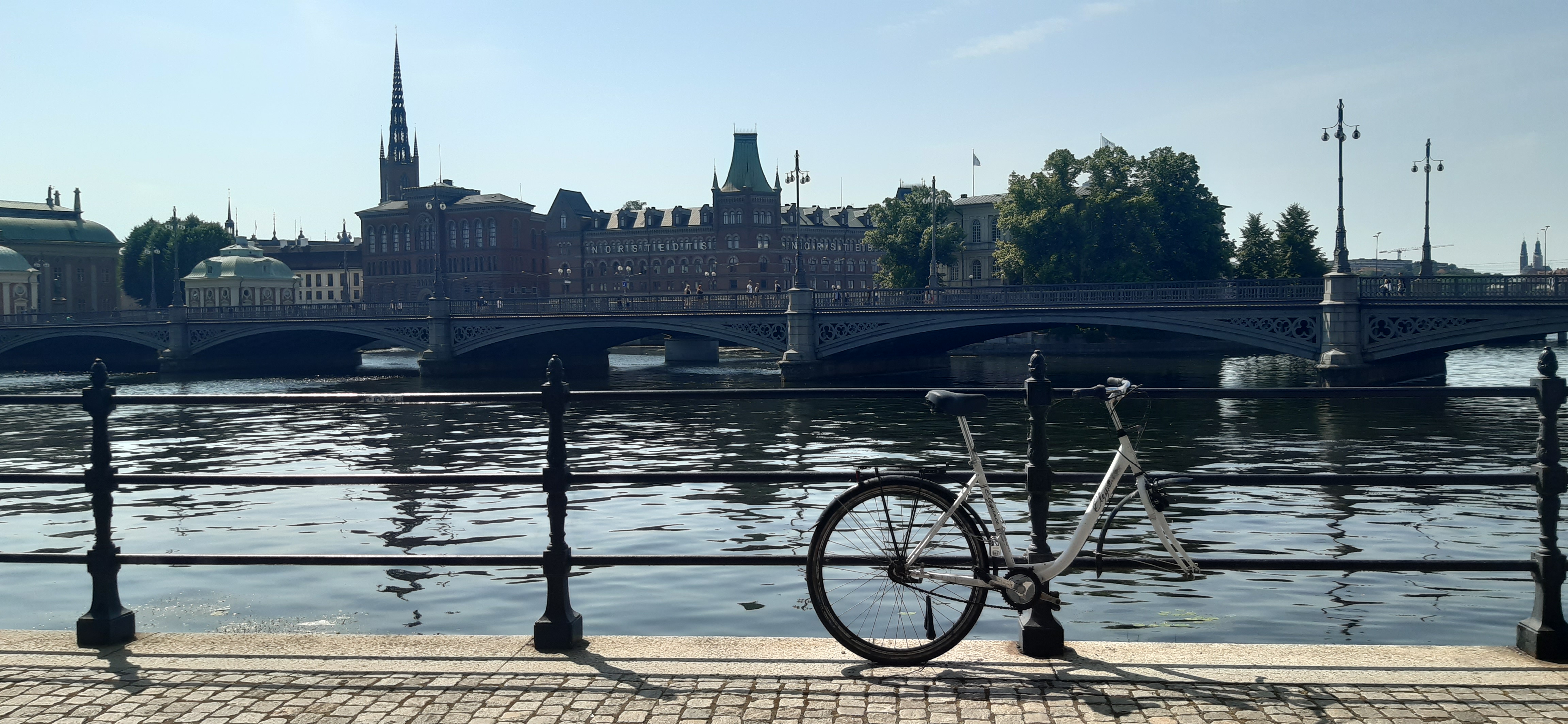 Nachdem ich Kastellholmen einmal der Länge nach mittendurch durchschritten und am Ufer wieder zurück gewandert war, ging ich wieder zurück nach Skeppsholmen und auf einem anderen Weg zurück Richtung Skeppsholmenbron und dann über dieselbe wieder nach Norrmalm. Ich ging wieder in Richtung Bahnhof und bog über die Strömbron nach Gamla stan ab. Mein Ziel war, die Altstadt komplett zu durchqueren und dann bis nach Södermalm zu gehen. In Gamla Stan erstand ich noch drei weitere Postkarten (ich hatte noch drei Briefmarken über) und setzte mich in den Biergarten eines Lokals namens „Under Kastanjen“ unter eine große Kastanie. Ich hatte mir ein Three Towns Lager aus dem Lokal geholt und schrieb im Schatten des Baumes die drei Karten. Apropos Schatten: Lt. meiner Wetterapp hatte es satte 33°, der Himmel war erneut wolkenlos und es war wichtig, ab und zu Schatten zu suchen und genügend Wasser zu trinken.