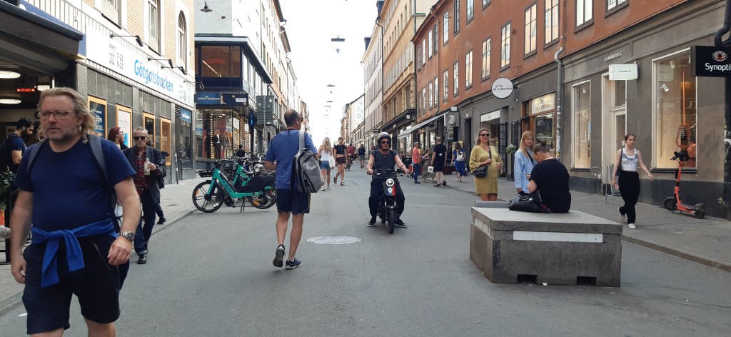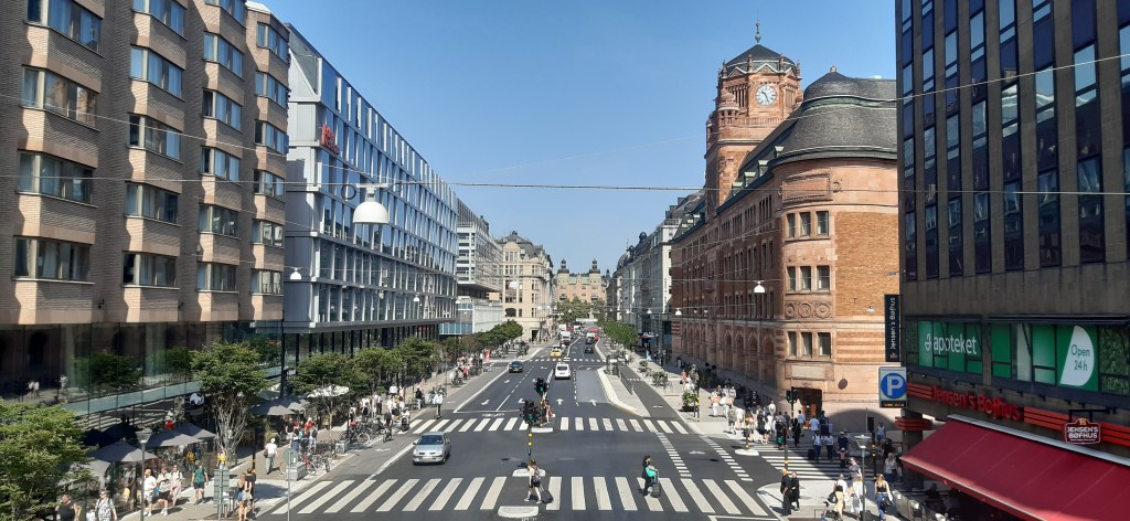 Dass die Gegend günstiger wurde, zeigte sich auch in Form abnehmender Bierpreise auf den Tafeln vor den Lokalen, an denen ich vorbei kam. Meine Bier auf Skeppsholmen und in Gamla stan hatten jeweils 79 Kronen gekostet. Zuerst entdeckte ich ein Schild für Budweiser mit 58 Kronen. Weiter im Süden dann ein Schild „Starköl 40cl 32 sek, 50 cl 39 sek. Na, das sind doch mal normale, wenn nicht gar günstige Preise. (Ich bin übrigens nicht sicher, ab wann hier Bier Starköl genannt wird. Die Alkoholgesetzgebung in Schweden ist ja strickter als bei uns, und das Corona z.B. hat hier, glaube ich, weniger Alkohol als bei uns, irgendwas bei weniger als 4%).