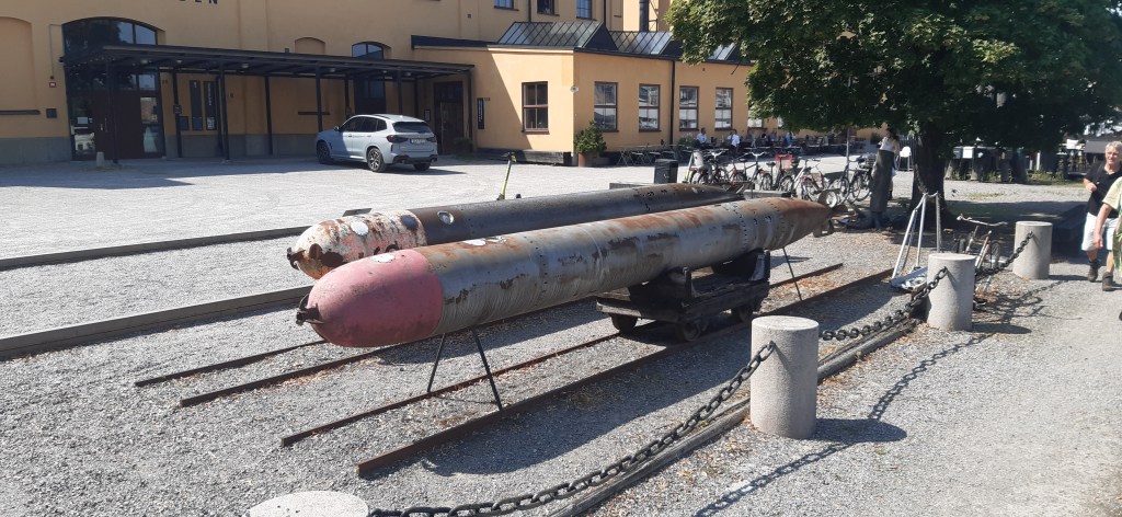 Am Restaurant/Café „Torpedverkstan“ (ja, genau: Torpedowerkstatt) machte ich Pause und gönnte mir ein Budweiser. Skeppsholmen und die benachbarte Insel Kastellholmen waren früher mal ein Marinestützpunkt gewesen, was die Sache mit den Torpedos erklärt. Drei (sicherlich demilitarisierte) Exemplare waren in unmittelbarer Näher des Biergartens auch ausgestellt, dazu auch ein Geschütz (vermutlich alles aus der Zeit des zweiten Weltkrieges).