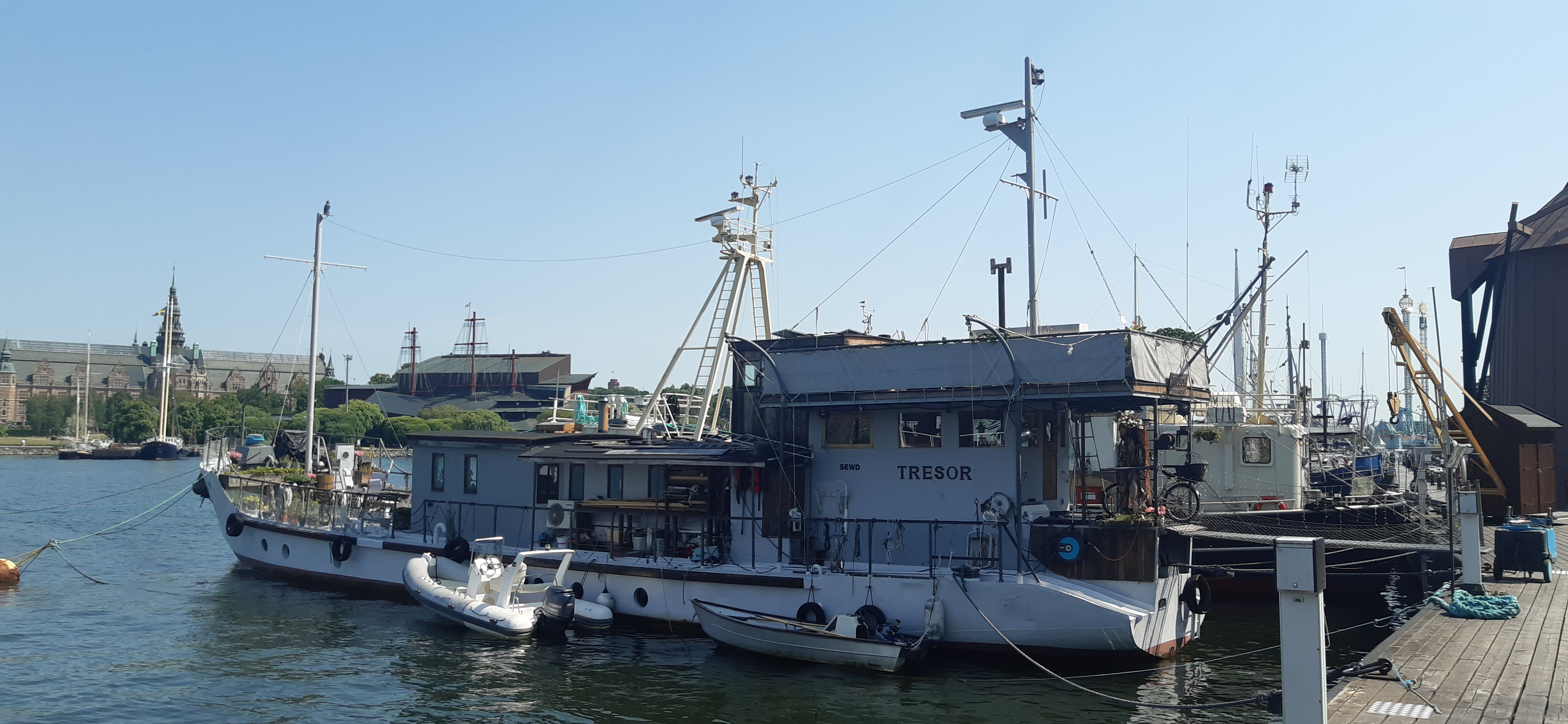 Schließlich machte ich mich auf den Weg, meinen Tagesplan umzusetzen. Im Prinzip hatte ich keine Lust, noch irgendwelche Museen zu besuchen – derer gibt es hier viele, von einem Sielzeugmuseum über das Spritmuseum, das Vikinger-Museum, das Abba-Museum und vieles mehr. Gut, das Nordisk-Museum für schwedische Kulturgeschichte, das Abba-Museum und das Wikinger-Museum sind natürlich schon speziell für die Gegend hier, reizen mich aber thematisch nicht so sehr. Und alles andere wiederum hat nicht unbedingt etwas mit Stockholm oder Schweden zu tun. Also entschied ich mich, einfach zu Fuß weiter die Gegend zu erkunden und paar km unter die Sohlen zu nehmen. Zuerst ging ich nach Skeppsholmen, eine Insel, auf die man von Norrmalm über die Skeppsholmsbron gelangt. Dahin musste ich vom Bahnhof aus ein wenig am Wasser den Strömsgatan entlang laufen und die Brücken zur Parlamentsinsel und nach Gamla stan rechts liegen lassen. Auf Skeppsholmen sah ich rechts das Segelschiff/Hostel Af Chapman liegen, entschied mich dann aber, die Insel linksherum am Ufer entlang zu wandern. Auf der Wasserseite lagen etliche Boote am Kai, viele hatten einen (wenn auch jungen) historischen Hintergrund und deswegen eine Beschreibungstafel.