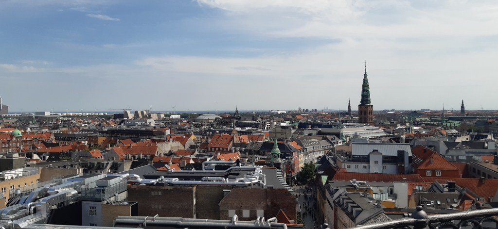 Der große Turm rechts im Bild gehört zur ehemaligen Nikolaj Kirke, heute ist das eine Kunsthalle. der aus dieser Perspektive kleinere Turm links daneben ist der Turm der Erlöserkirche, auf dem ich auch war. Wenn man das Bild vergrößert, kann man links daneben ganz in Hintergrund sogar die Öresundbrücke erkennen.