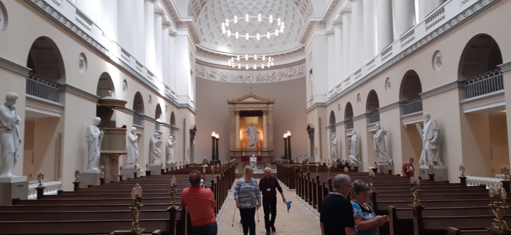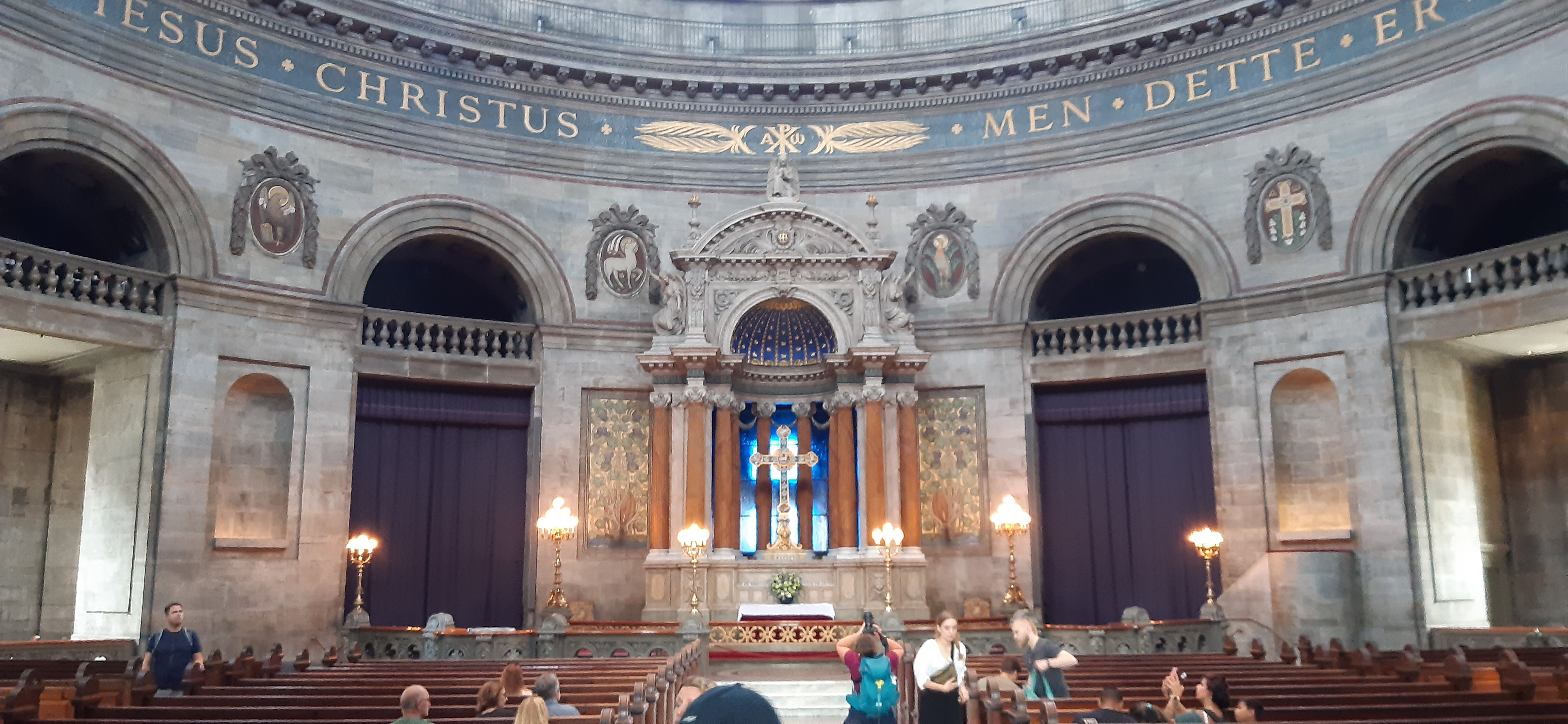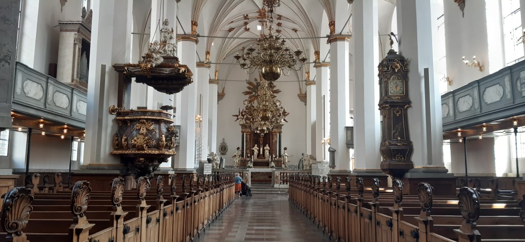 An der vierten Station Marmorkirke stieg ich also aus und betrat den großen Kuppelbau der Frederikskirke, lt. Google Maps im Rokoko-Stil. Im Eingangsbereich sah ich einen Holzschnitt, der darstellt, wie Jesu‘ Leichnahm nach seinem Tod vom Kreuz abgenommen und Joseph von Arimathäa übergeben wird. Das fand ich insofen interessant, weil ich mich nicht erinnern kann, von dieser biblischen Szene zuvor jemals eine bildliche Darstellung gesehen zu haben. In einen Marmorpfeiler (die Kirche wird ja nicht umsonst auch „Marmorkirche“ genannt) waren die bisher 15 in der Kirche tätigen Pastoren eingraviert. Der gegenwärtige, Mikkel Wold, ist immerhin schon seit 1994 im Dienst. Ansonsten… nunja, eine Kuppel mit Deckengemälde, ein prächtiger Säulenaltar. An der Orgel ist mir aufgefallen, dass wie bei einigen, aber nicht so vielen Kirchenorgel, eine Anordnung von Pfeifen an der Empore angebracht war. Ich weiß nicht, wie man das nennt. Wenn eine Kirchenorgel klassisch einen Spieltisch so angeordnet hat, dass die spielende Person dem Altar den Rücken zuwendet, dann nennt man die Pfeifenanordnung in der Mitte oberhalb des Spieltisches „Brustwerk“ und die rechts und links das Brustwerk flankierenden Pfeifen-Phalanxen „Seitenwerke“. Aber wie man so eine Anordnung an der Empore nennt, weiß ich nicht – vielleicht „Bauchwerk“? Mein im Orgelspiel ausgebildeter, jüngerer Neffe müsste das wissen.