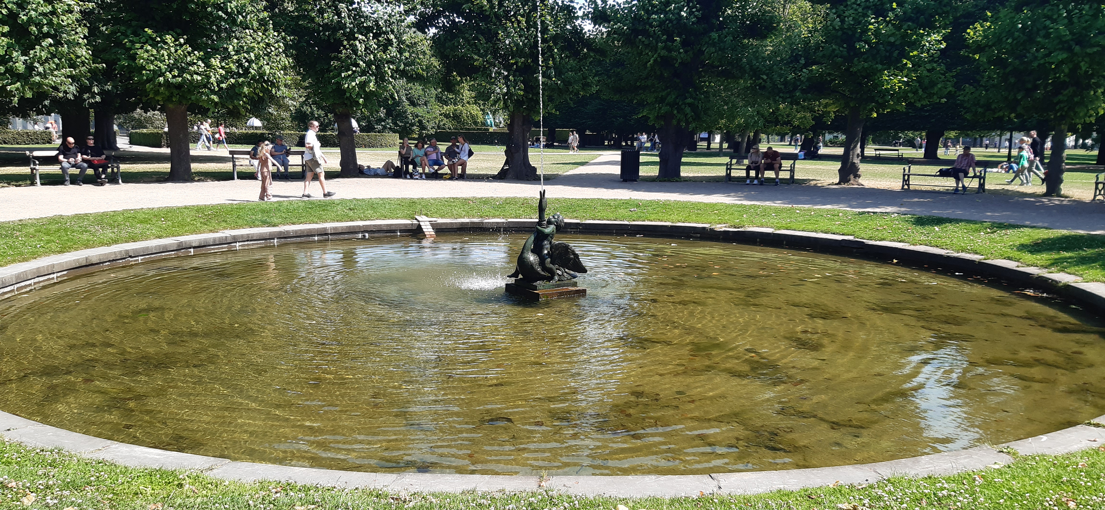 Bevor ich dem Weg, den mir das Schlaufon anzeigte, weiter folgte, sah ich mich noch ein wenig im Park um. Da saß beispielsweise Hans Christian Andersen, ein Buch in der Hand, auf einem Marmorsockel. Dann sah ich eine Skulptur eines Wasservogels, auf dem ein Junge saß, der Junge umklammerte den langen Hals des Tieres, welches den Schnabel senkrecht in die Luft reckte und eine Wasserfontäne ausspie. Ich dachte, durch die Andersen-Statue voreingenommen, dass es sich vielleicht um Nils Holgersson handeln könne (obwohl die Geschichte von der schwedischen Autorin Selma Lagerlöf ist, nicht von H.C. Andersen), aber auf einer Steintafel stand „Drengen på svanen af Herman Ernst Freund“ (Junge auf dem Schwan von Herman Ernst Freund). Für mich sah das nicht so nett aus, eher als würge der Junge den Schwan am langen Halse…
