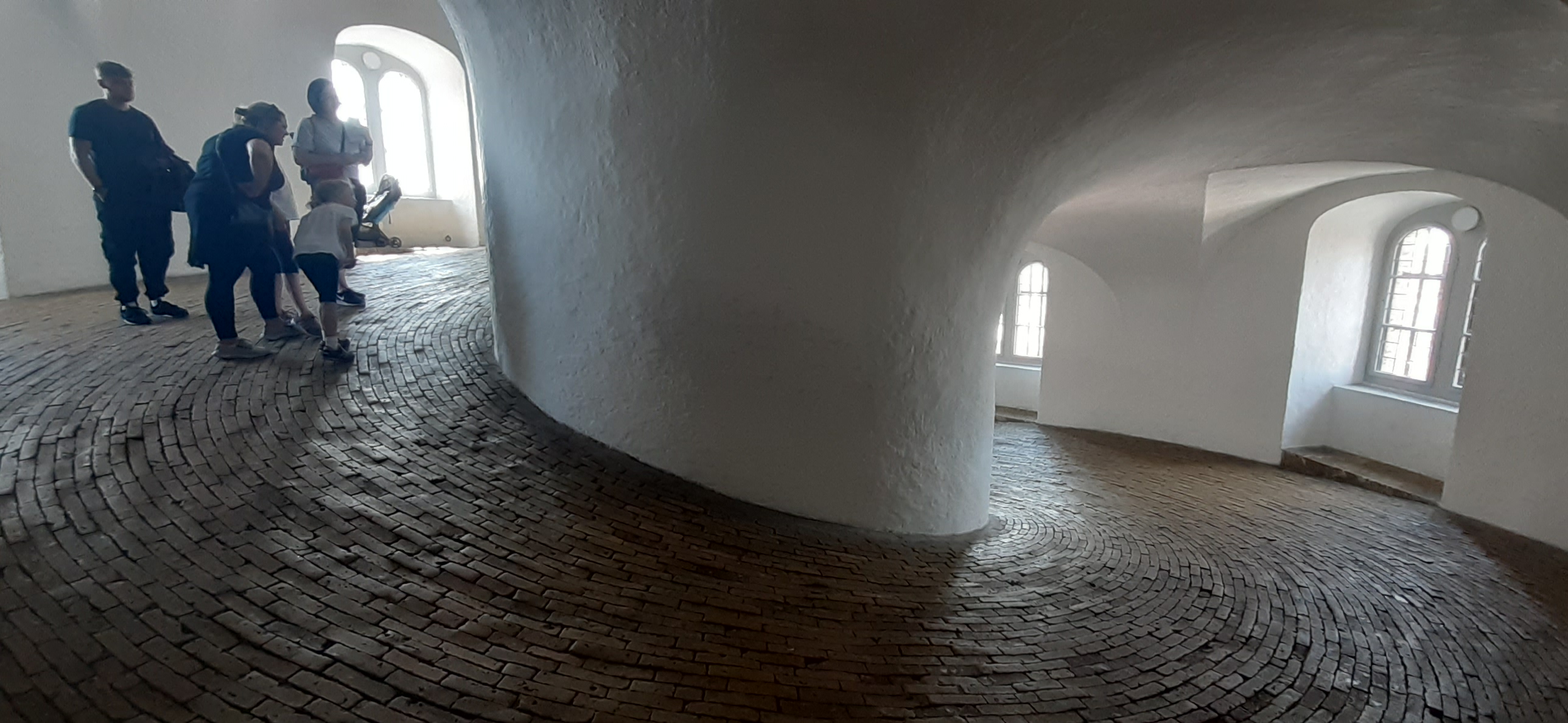 Den Turm besteigt man im Wesentlichen nicht über Treppen, sondern über eine spiralförmige, schiefe Ebene, auch „Pferdetreppe“ genannt. Sie ermöglichte es, z.B. Bücher und astronomische Instrumente mit einer kleinen Pferdekutsche auf den Turm zu bringen. Der spiralförmige Weg führt um einen Kern, man könnte auch sagen, eine Röhre, herum, die den geografischen Mittelpunkt Dänemark darstellt, von hier aus wurde das Land erstmals vermessen und kartografiert. Das letzte Stück zur Aussichtsplattform muss man über eine Treppe erklimmen, die zu schmal ist, als dass gleichzeitig auf- und absteigende Leute sie passieren könnten. Im Gegensatz zur Erlöserkirche, wo das teilweise genauso war (und man das irgendwie selbst organisieren musste), regelte hier ein Ampelsystem den Auf- und Ab-Verkehr.
