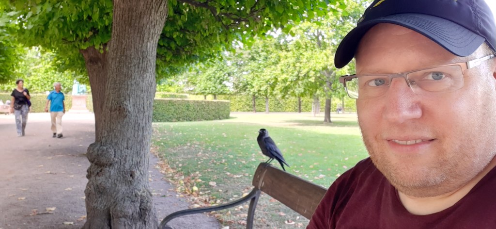 Ein Selfie darf es dann doch noch sein: Ich teile mir eine Parkbank mit einem Rabenvogel.
