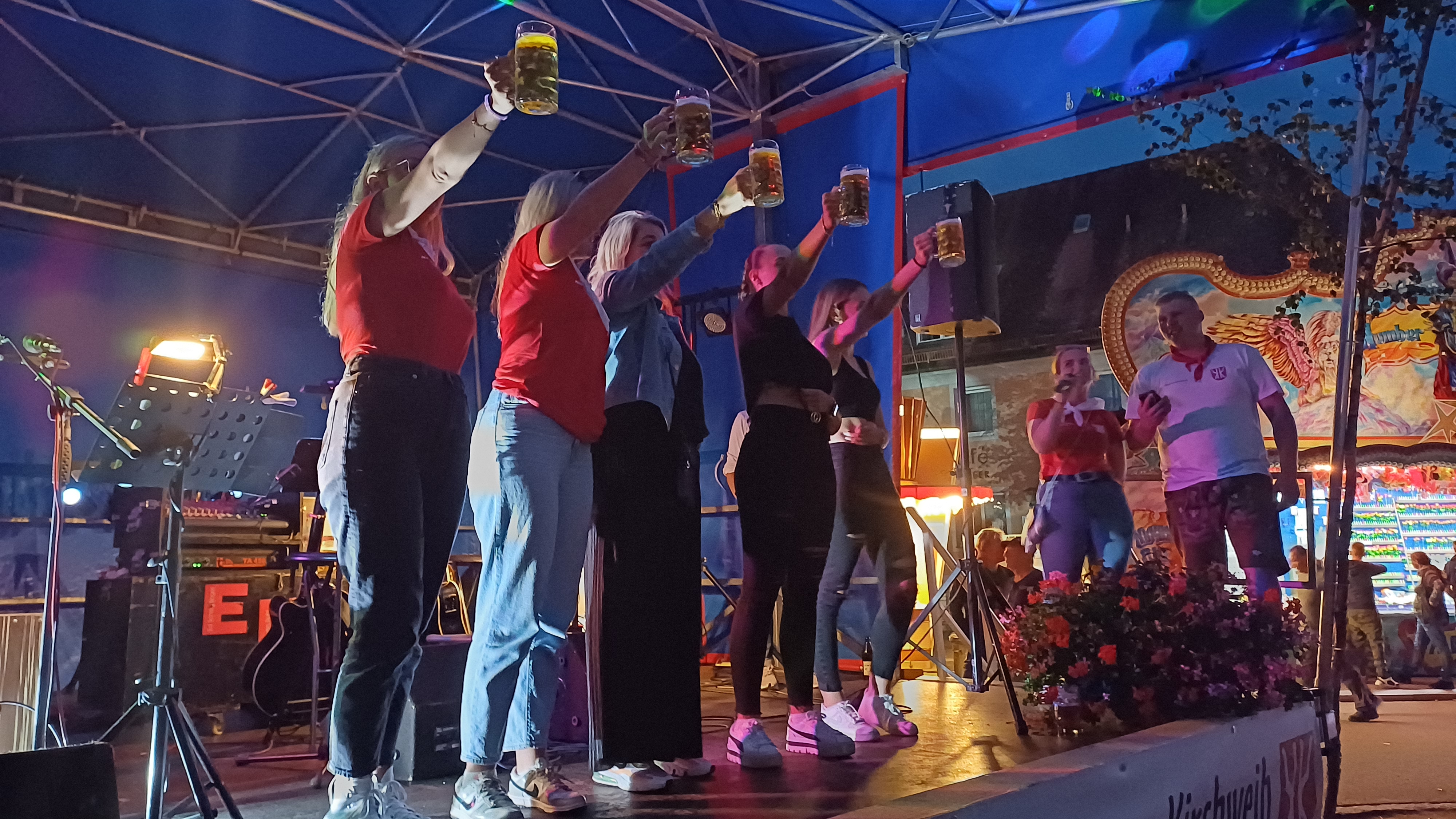 Nach dem Abendessen ging es weiter, wieder auf die Kerwa. Wieder zwei Maß und ein „saure“ Weinschorle. Wir trafen einige Leute erneut, andere, die mir vorher unbekannt waren, und es war recht lustig. Das Wetter kippte zwischenzeitlich in Gewitter und so starken Wind, dass meine Gastgeberin mir bedeutete, ich möge doch mal eine Stange des Zeltes festhalten, um es am Davonfliegen zu hindern. Zwischenzeitlich hielt ich mich an der Bühne auf. Die Band gefiel mir besser als die am Vortag aber ich war an der Bühnenkante nicht deswegen, sondern um erst die Damen (darunter die genannte Bürgerschützen-Königin, die ihre Mutter locker ausstach) und dann die Herren beim Bierkrugstemmen anzufeuern.