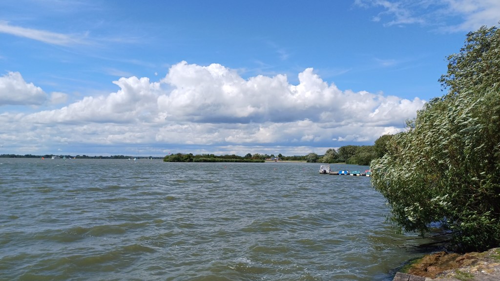 Wie auch immer, wie fuhren so 4 km dahin, erstmal mit starkem Rückenwind. Meine Gastgeberin mit ihrem neuen E-Bike, ich mit dem alten Rad ihres Dad. Dabei trafen wir auch den Gastgeber mit seinem Rad in Gegenrichtung, der eine längere Tour fuhr. Wir umrundeten den See nicht (ca. 13 km) sondern fuhren nur zum Fortsatz bei Schlungenhof, zum Anleger der MS Altmühlsee. Danach wendeten wir und fuhren ein kurzes Stück zurück, um an einem der vielen „Kioske“ (so nennt man da die Gastronomie am See) ein Getränk zu uns zu nehmen. Ich konnte mir nicht merken, wie mein Bier hieß, es war kein Spalter. Während man dort am Getränk nuckelt, kann man den Wasersporttreibenden beim Verunglücken zusehen. Äh Spaß, viele können es offenbar ziemlich gut und genossen den starken Wind, der für meine Gastgeberin schon etwas drüber war. Nicht für Wassersport, sondern zum Existieren an sich.