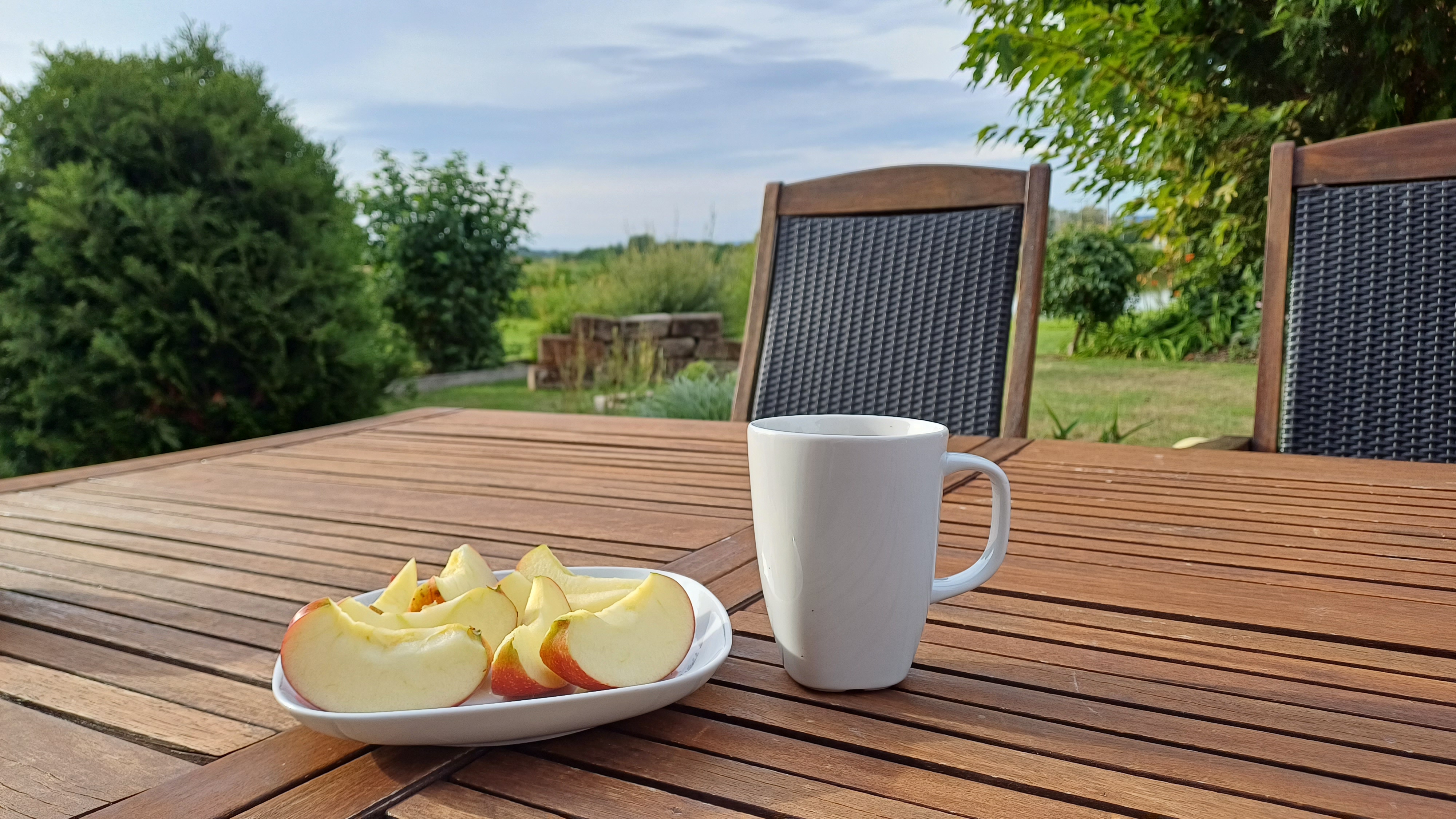 Nach der Morgentoilette und Sachen zusammenpacken gab mir meine Gastgeberin einen Kaffee und ich verzehrte ihn mit einem Apfel als erstes Frühstück auf der Terasse mit Blick auf den Fischweiher (und fast auf das Transformatorhäuschen, an das die Touristen vom Campingplatz immer gegenpinkeln, wenn man meinen Gastgeber in dieser Sache Glauben schenkt, was ich natürlich tue – aber leider steht ein Baum davor). Danach verfrachtete ich meinen Koffer Bob und meinen Rucksack in den Kofferraum meiner Gastgeberin, die mich zum Bahnhof kutschierte. Ich bin meinen beiden lieben Gastgebern sehr dankbar, es war eine großartige Zeit für mich in deren schönen Haus in Muhr am See, auch wenn das Wetter nicht ganz toll mitgespielt hat (aber ehrlich: wir brauchen den Regen!).