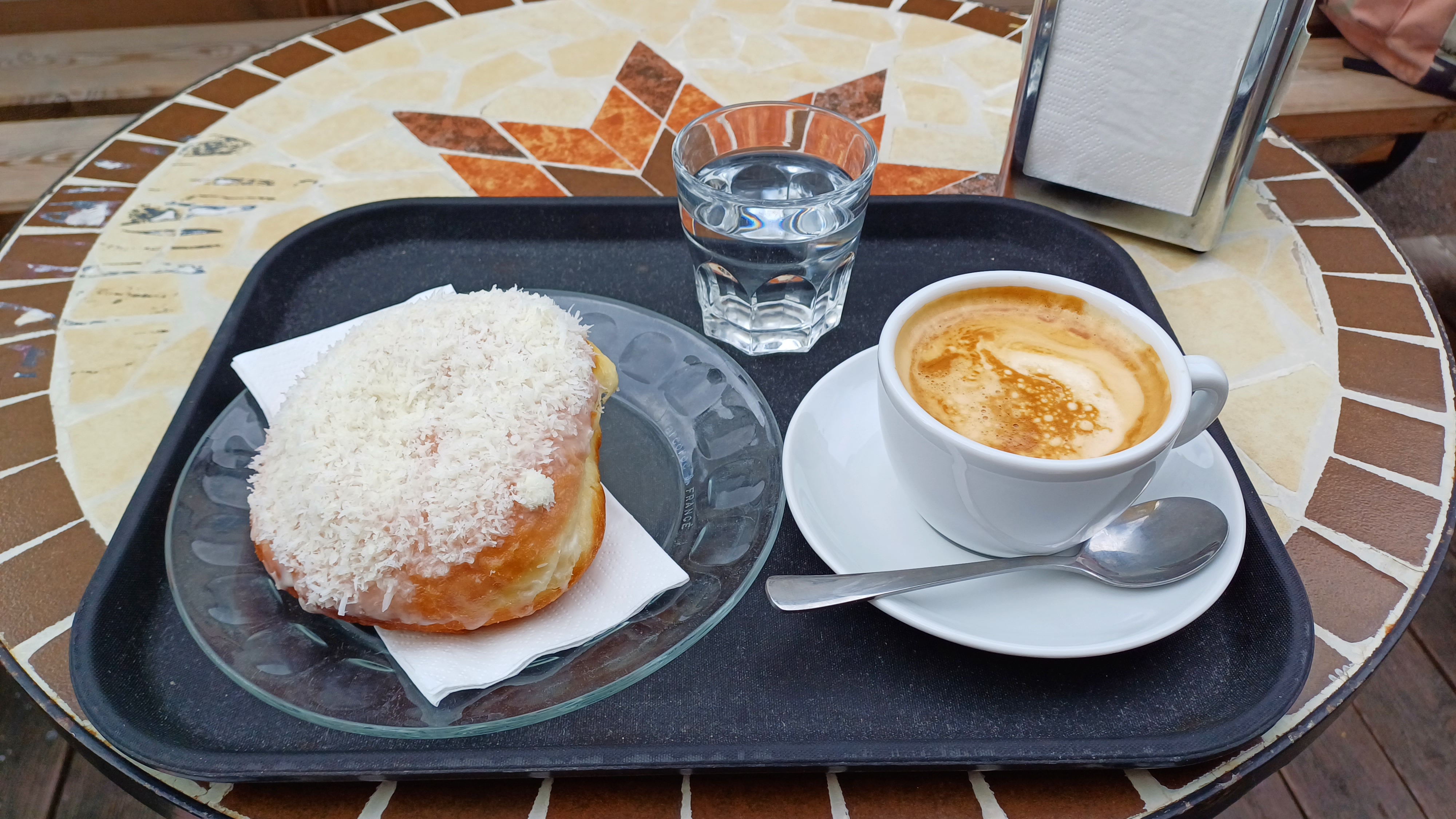 Dieses erreichte ich nach zehn Minuten (höchstens) zu Fuß. Bedienung gab es nicht, aber man konnte etwas zum Verzehr erwerben und an Tischen draußen zu sich nehmen, was ich auch tat. Einen Kokoskrapfen und eine Wiener Melange, beides sehr lecker.