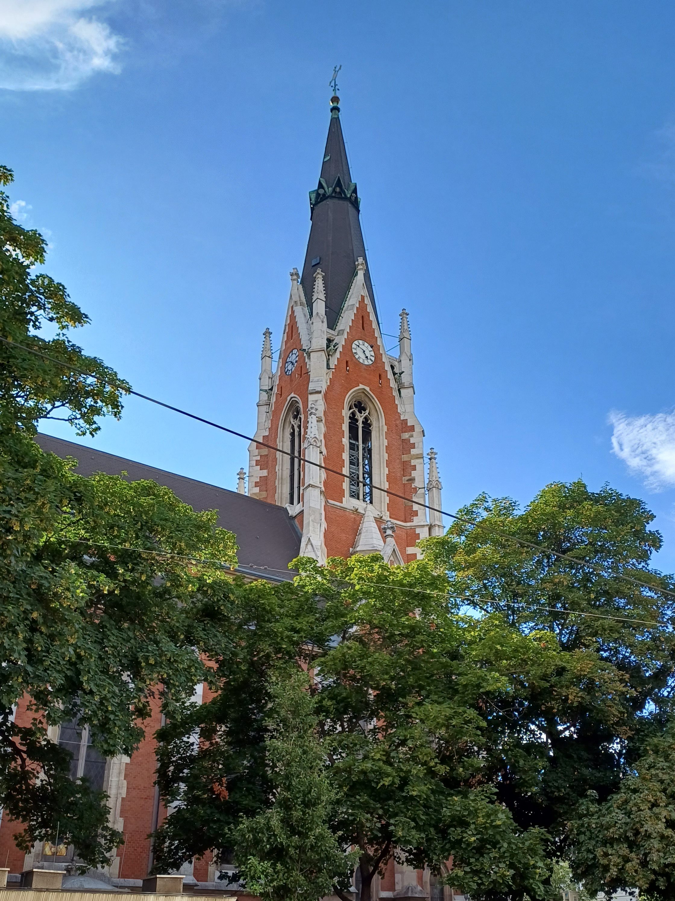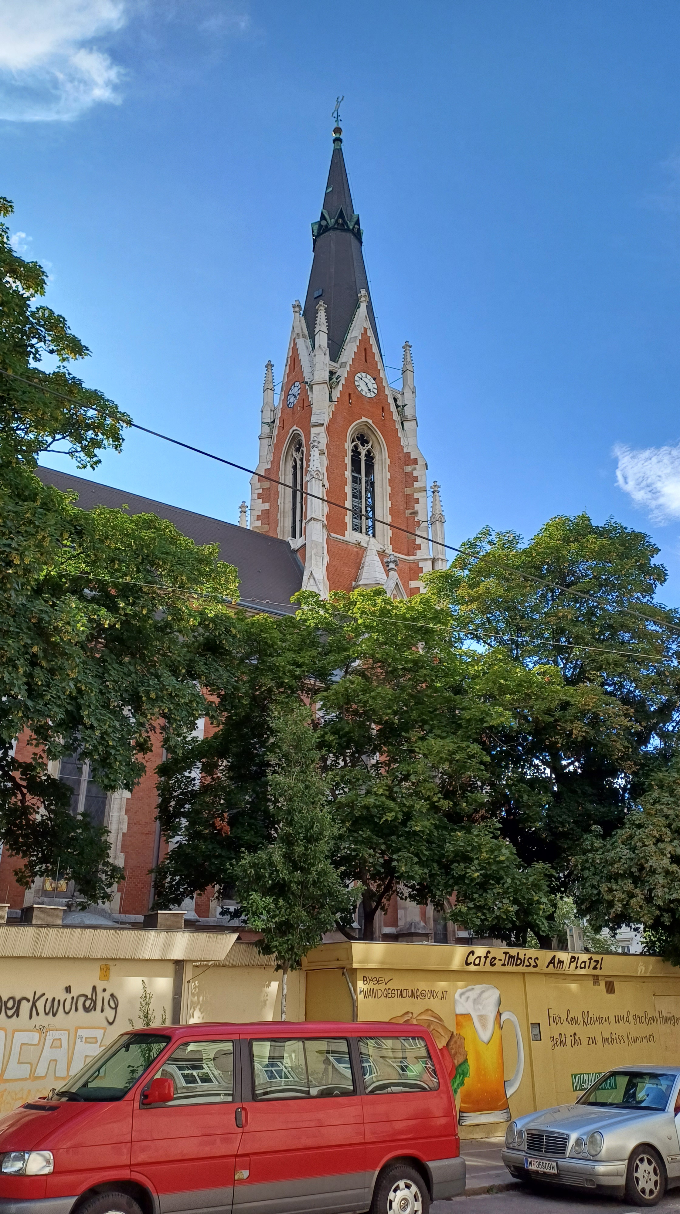 Einen Plan hatte ich zu der Zeit nicht wirklich, ich wollte einfach zu Fuß die Umgebung erkunden und das schöne Wetter genießen. Ich besorgte mir bei einem Sparmarkt ein Gösser Radler. Von da aus war schon eine imposante Kirche zu sehen, die ich mir aus der Nähe ansehen wollte. Es war die St. Elisabeth Kirche zur frohen Botschaft. Ich schaute sie mir dann aber erst einmal nur von außen an, einerseits, weil ich vermutete, dass ich da vermutlich noch einmal hinkomme, andererseits, weil es mich weiter trieb.