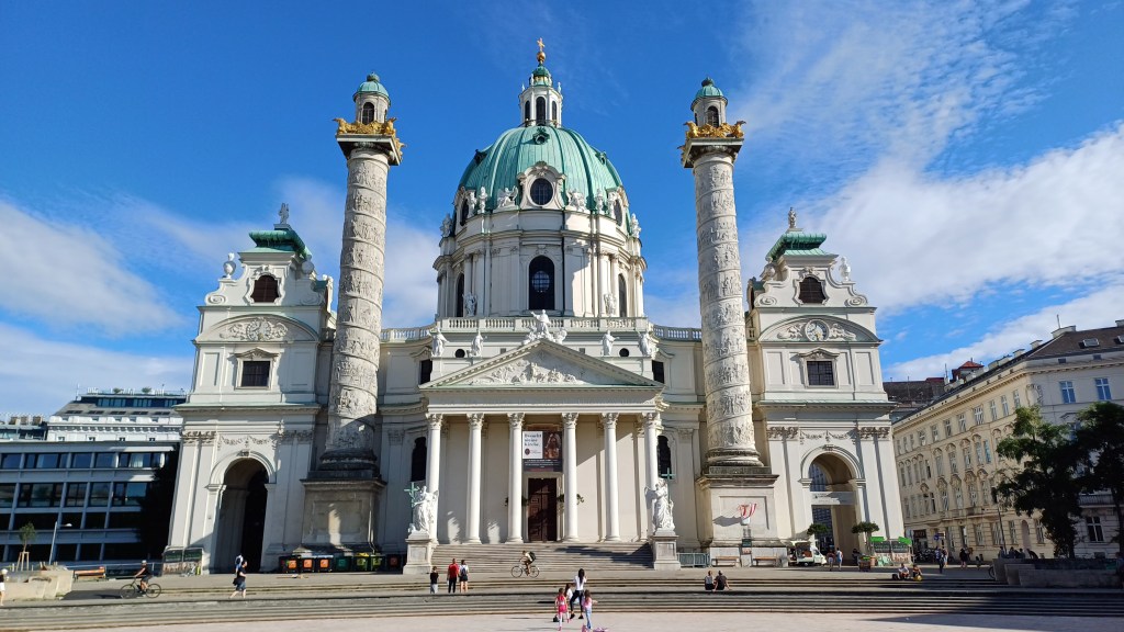 Die Richtung, zunächst immer der Argentinierstraße lang, war eigentlich alleine durch die Wahl von „Café Brot“ bestimmt worden. Aber sie führte mich an diverse Botschaften vorbei erst zur oben genannten Kirche, dann zur Karlskirche und zum Karlsplatz, und schließlich dicht an die Wiener Staatsoper.
